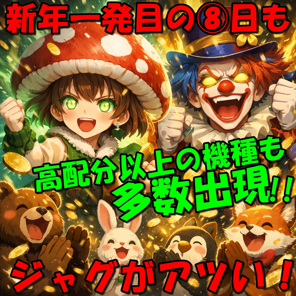 1月8日(木)|グランパ大久保|若葉まいたけさん&保留アオさん来店で迎えた2026年一発目の⑧の日は総差枚+7.4万枚の好結果発進!やっぱりジャグ系は超高配分仕様!その他からも最新台や人気機種に仕掛けバッチリでした!