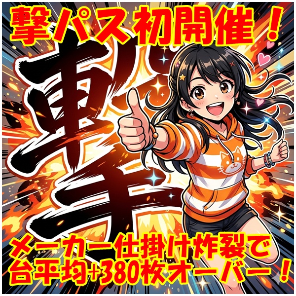 4月4日(土)│エスパス赤坂見附│撃パス初開催は平均+380枚超の好成績!!8店舗合同でSANKYO機種が強く今回の全台系は初のメーカ仕掛け!独り言もSANKYO絡みに!