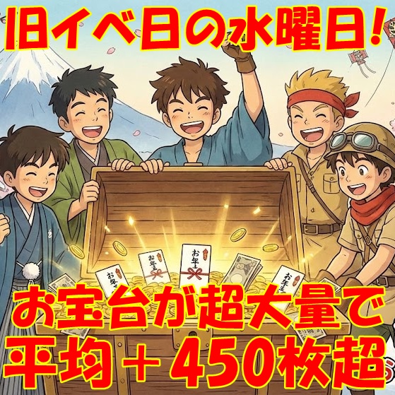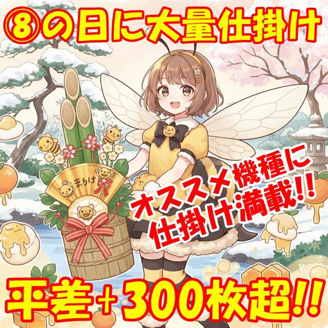 1月8日(木)│エスパス新大久保│今年も⑧の日は優秀仕掛け満載!オススメ機種やジャグといったメインどころを中心に好調機種が多数出現!全台系&1/2系濃厚の高配分機種や並びなど多彩な仕掛けが盛り込まれ、新年一発目から平均差枚+300枚オーバーの好成績に!