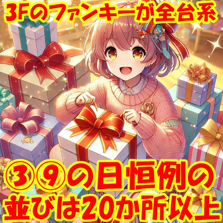 4月3日(金)|エスパス新宿歌舞伎町|③⑨の日に恒例の並びの仕掛けは大量21か所!同じく恒例の末尾の仕掛けに加えて王道の仕掛けも多数アリ!全台系濃厚となった3Fのファンキー2は全台がプラスの好成績に!
