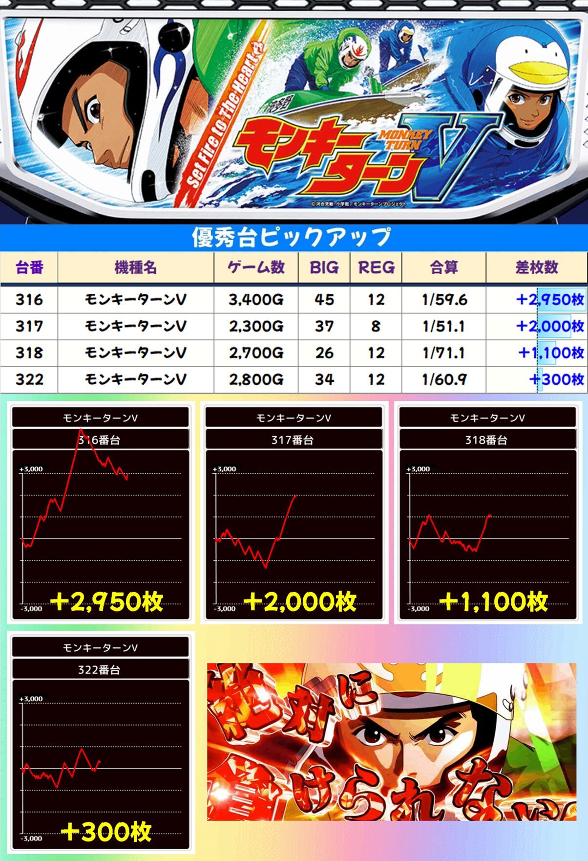 7台設置の「モンキーターンV」も高配分。4台がプラスで、その内の3台が+1,000枚オーバー! ⑥のつく日は多台数設置機種にも仕掛けがあります!