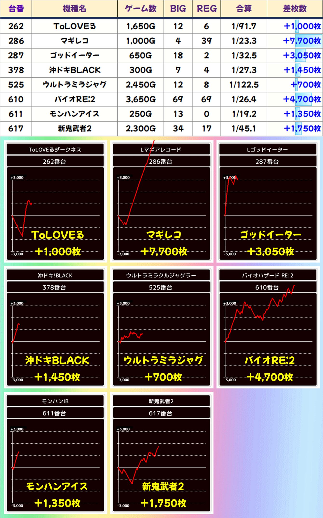 前回のリベンジ達成! 今回は「バイオヴェンデッタ」が+3,000枚オーバーの好成績! ⑥のつく日の「バイオヴェンデッタ」はヒキが嚙み合えばしっかり出る! 次回の⑥のつく日も狙い目ですよ!