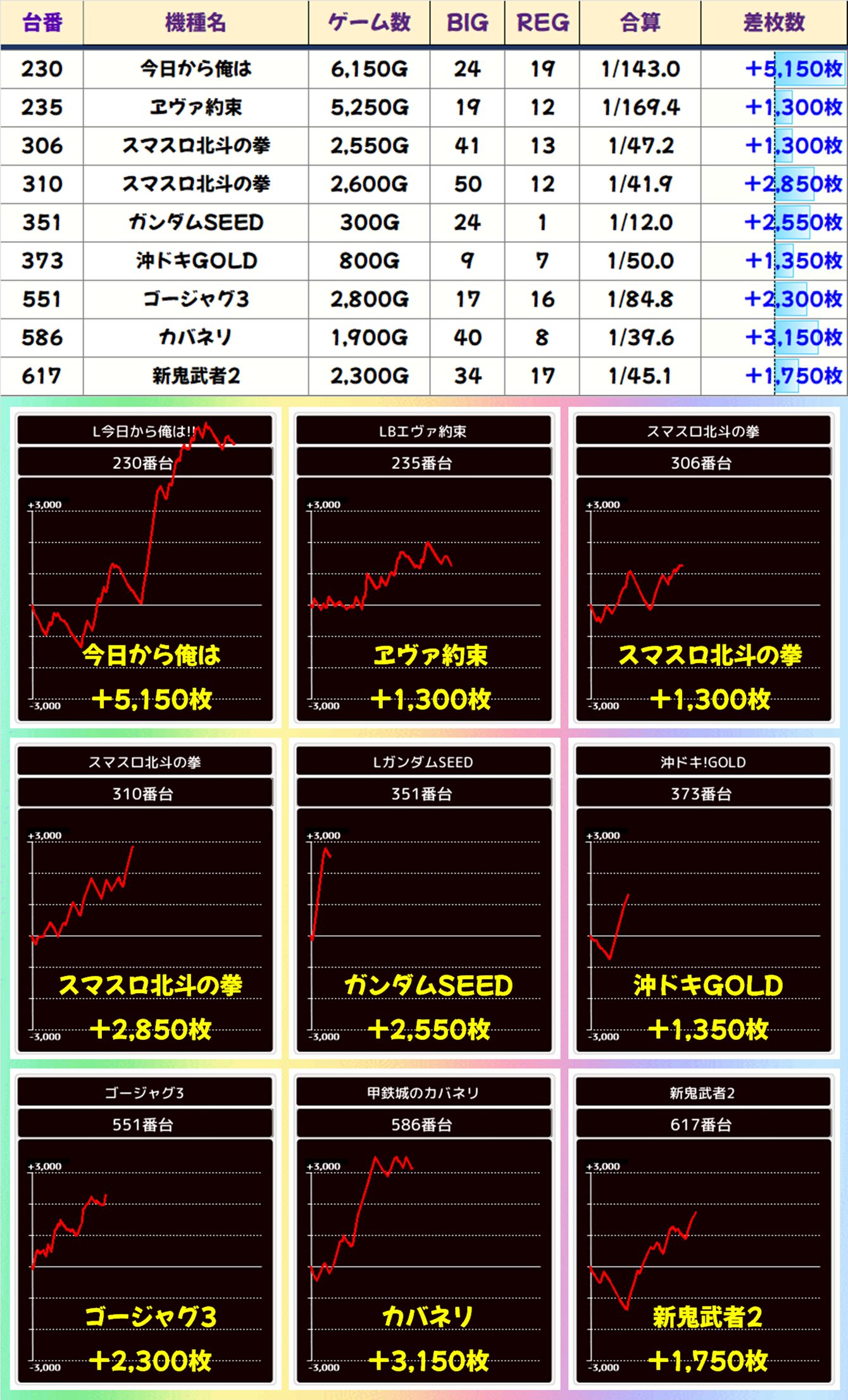 ⑥のつく日はお宝台が多数あるので狙いドコロ満載。本日も優秀台が多数出現しましたが、しっかり打ち込まれた台が多かったらもっと優秀台が出現したはず! 次回の⑥のつく日もお宝台が散りばめられているはずなので、高設定っぽい挙動を感じたらブン回して大勝ちを目指しましょう!