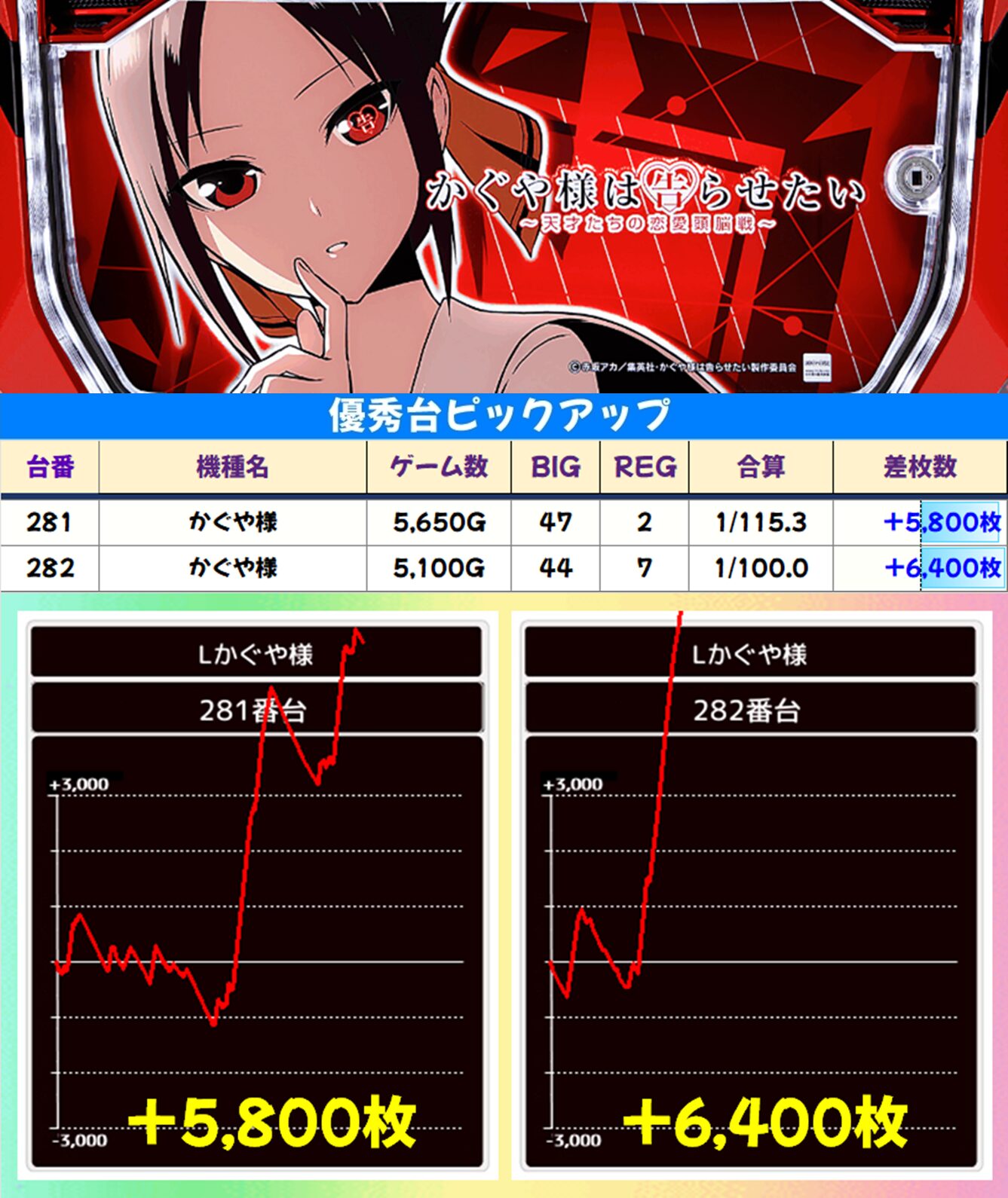 3台設置の「かぐや様」が高配分。結果は総差枚+10,350枚、平均差枚+3,450枚で3台中2台がプラス差枚。プラスの台は+6,400枚、+5,800枚と2台とも大量出玉を獲得して大勝利!