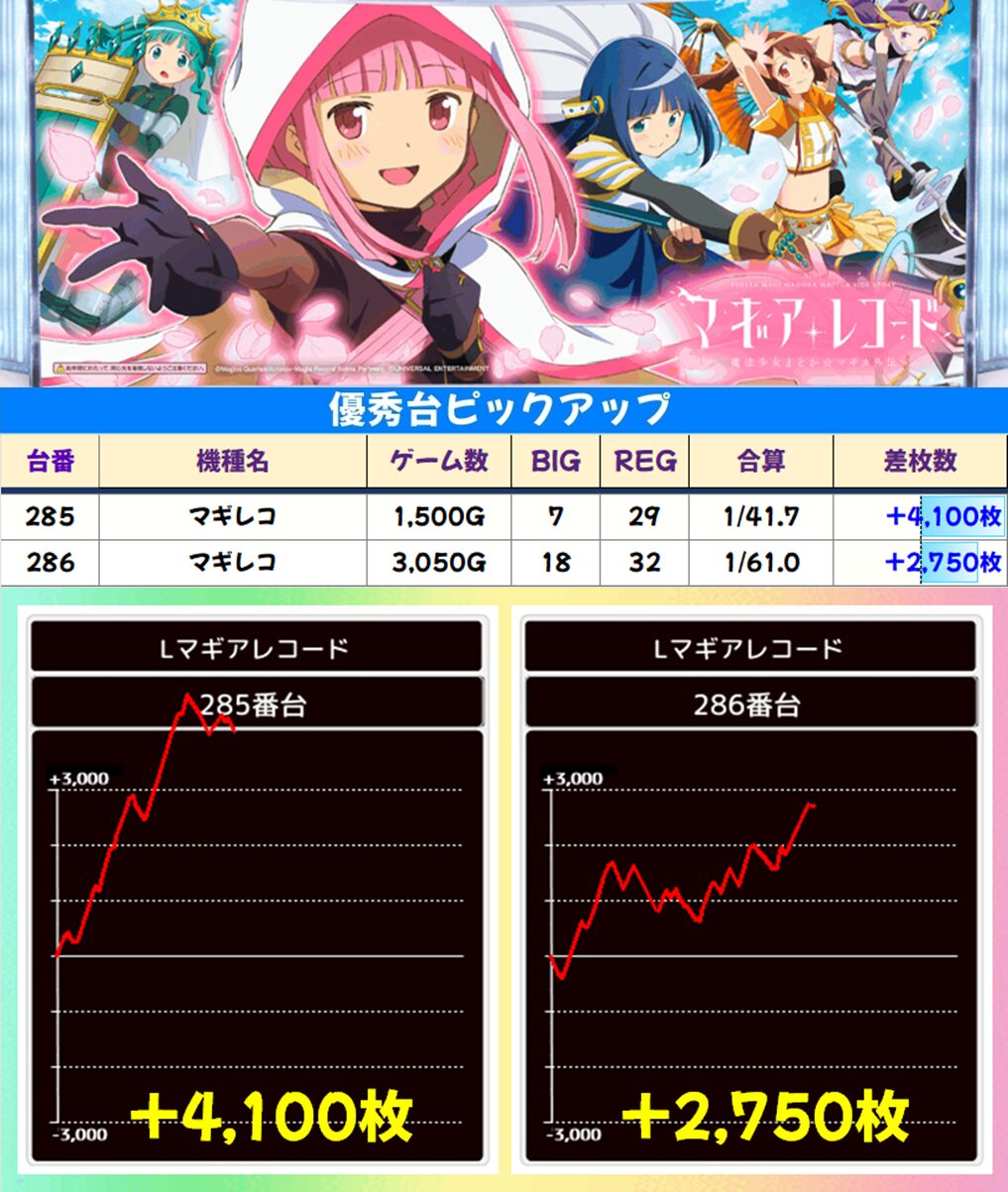 3台設置の「マギレコ」も高配分。プラスの2台はともに2,500枚以上の出玉を獲得して大勝利!