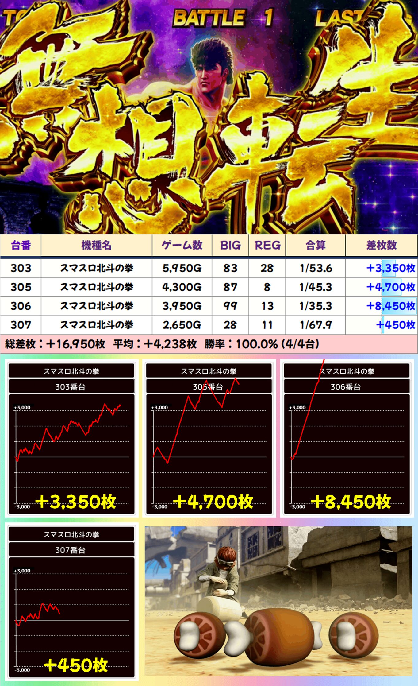「スマスロ北斗の拳」が高配分。結果は総差枚+14,700枚、平均差枚+1,838枚で5台がプラス差枚。+8,450枚、+4,700枚、+3,350枚と大量出玉獲得台も複数出現しました。