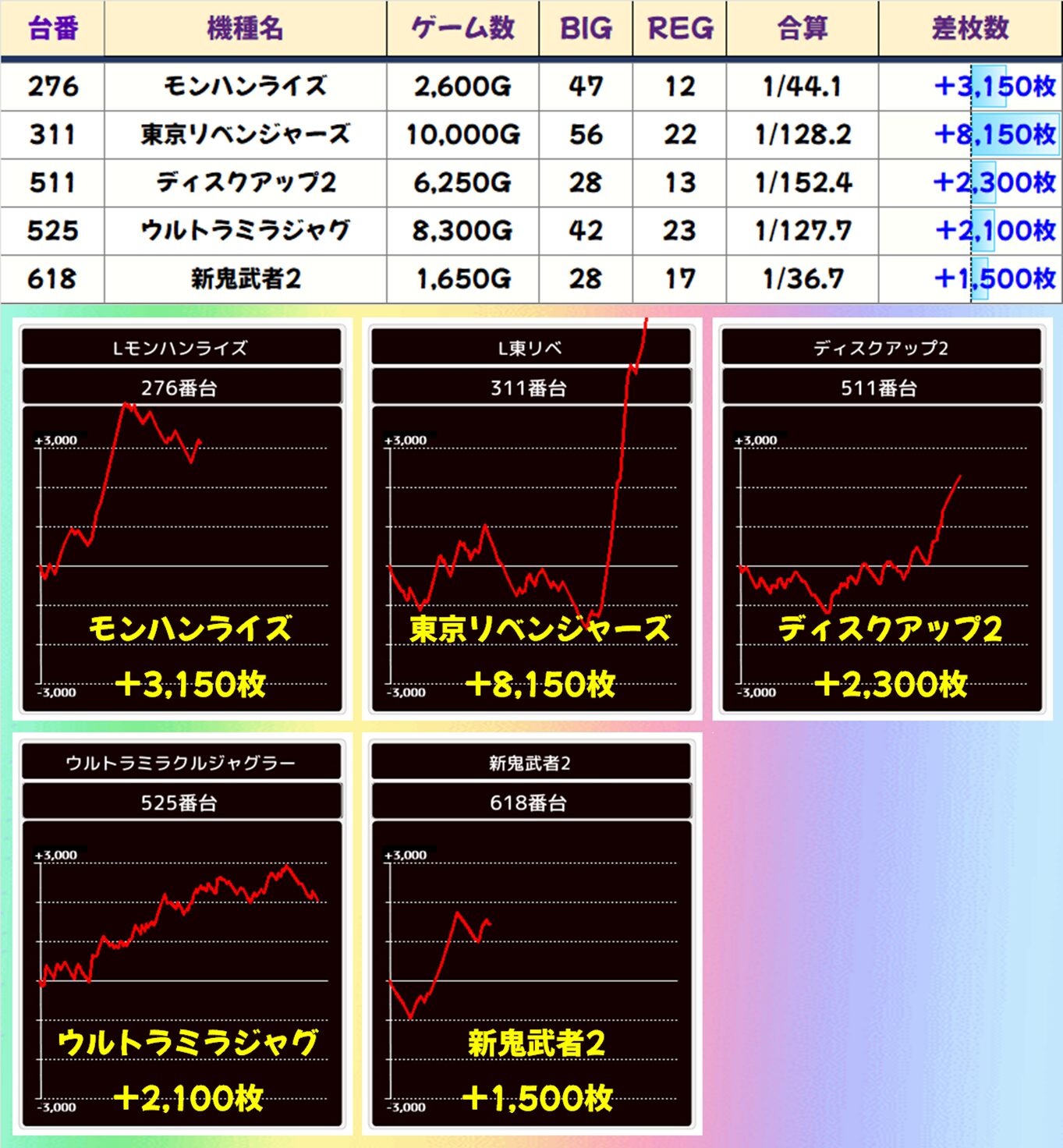 ⑥のつく日は仕掛けor機種イチに期待できる2~3台設置の少台数機種が狙い目。その傾向通り今回も少台数機種から優秀台が多数出現! 本日増台された「東京リベンジャーズ」から8,000枚オーバーの出玉も炸裂しました。