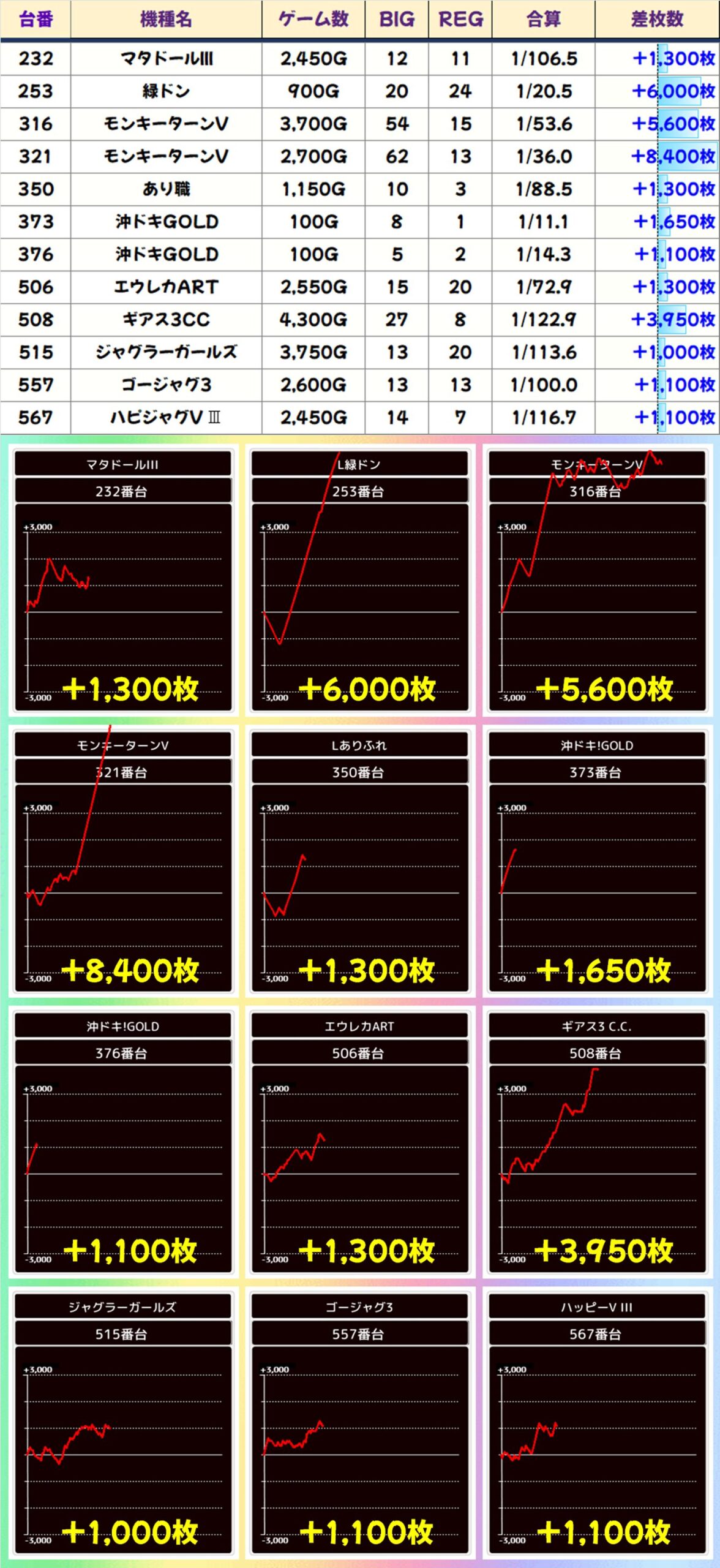 ⑥のつく日は単品も充実。「モンキーターンV」から+8,400枚、+5,600枚、「緑ドン」から+6,000枚と大爆発台も複数出現! ジャグラーシリーズにもしっかりお宝台がありました。