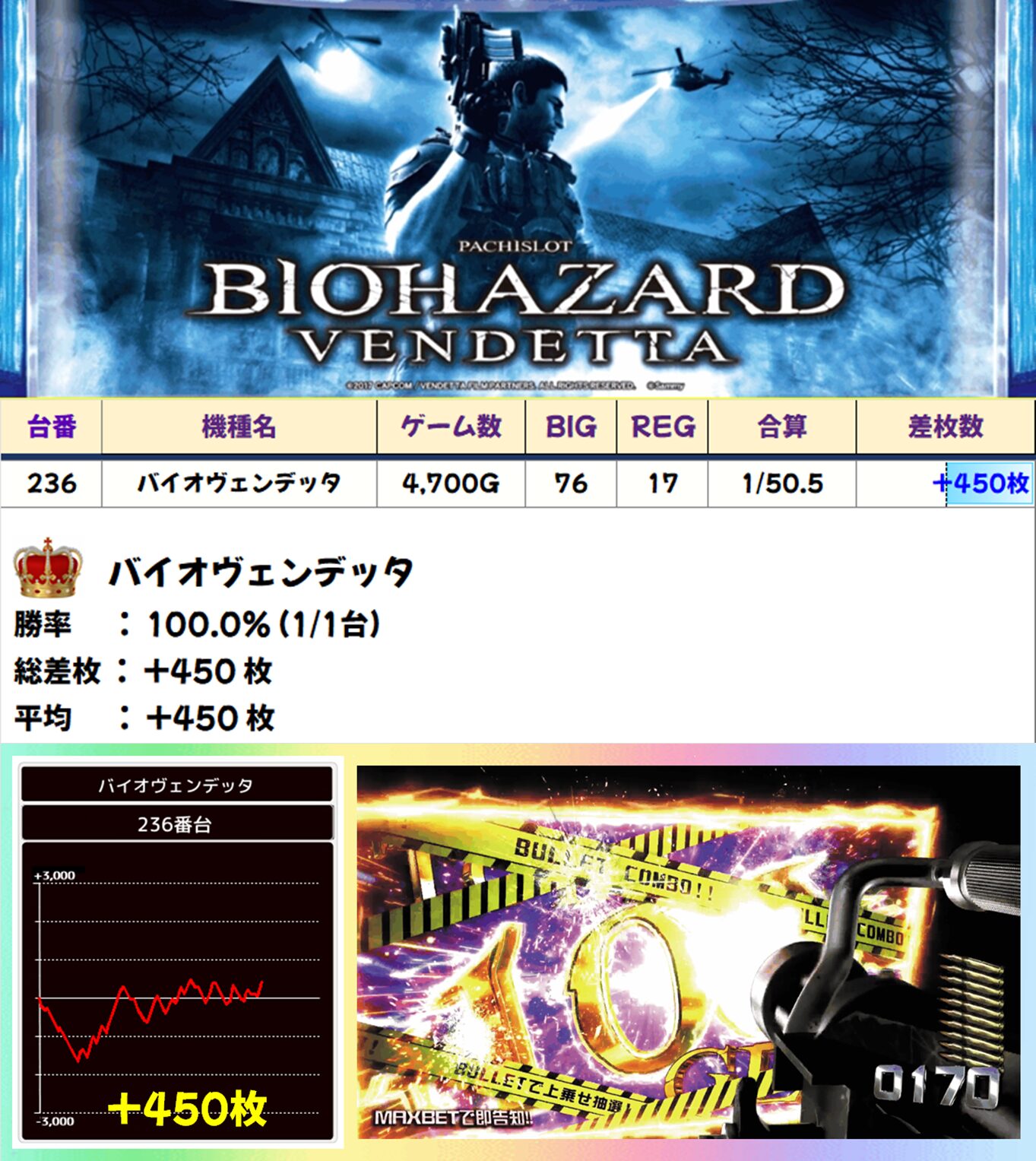 ⑥のつく日3回連続でプラス差枚の「バイオヴェンデッタ」が本日もしっかりプラス! これで⑥のつく日4回連続でプラス差枚! やはり⑥のつく日は「バイオヴェンデッタ」が鉄板ですね!