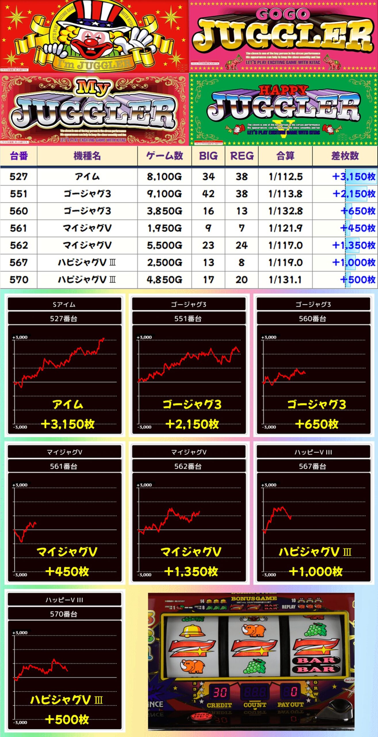 ジャグラーシリーズも抜かりナシ! ジャグラーシリーズにもお宝台が散りばめられているので、⑥のつく日に手堅く勝つならジャグラーシリーズ狙いがいいと思いますよ。