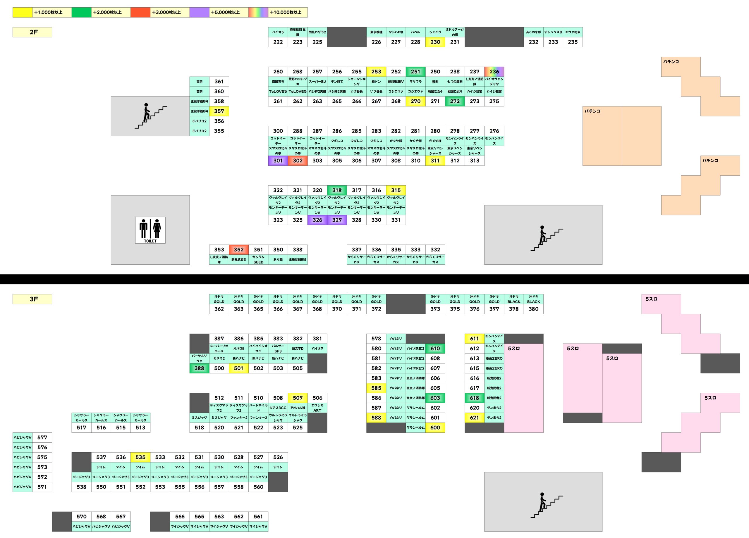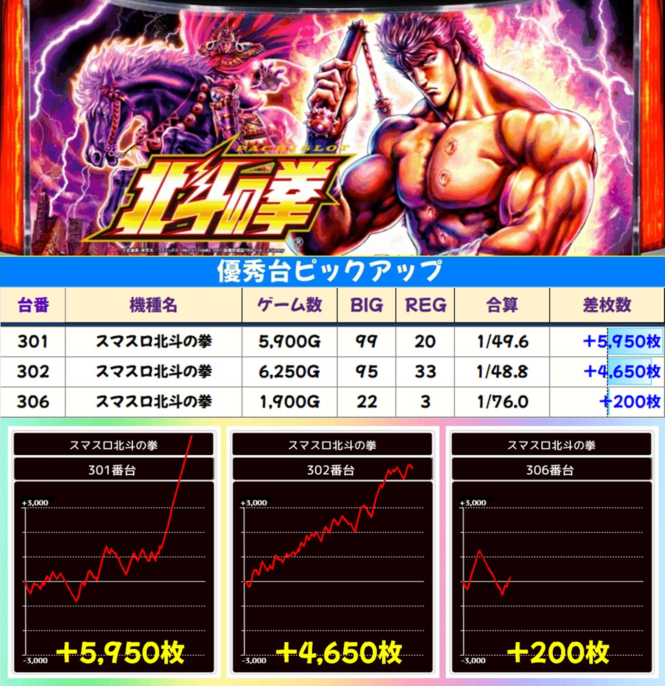 8台設置の「スマスロ北斗の拳」が高配分。301番台、302番台の初当り回数を見れば設定⑤⑥が投入されていたのは間違いなし。⑥のつく日は多台数設置のメイン機種も相変わらず扱いが良いですね。