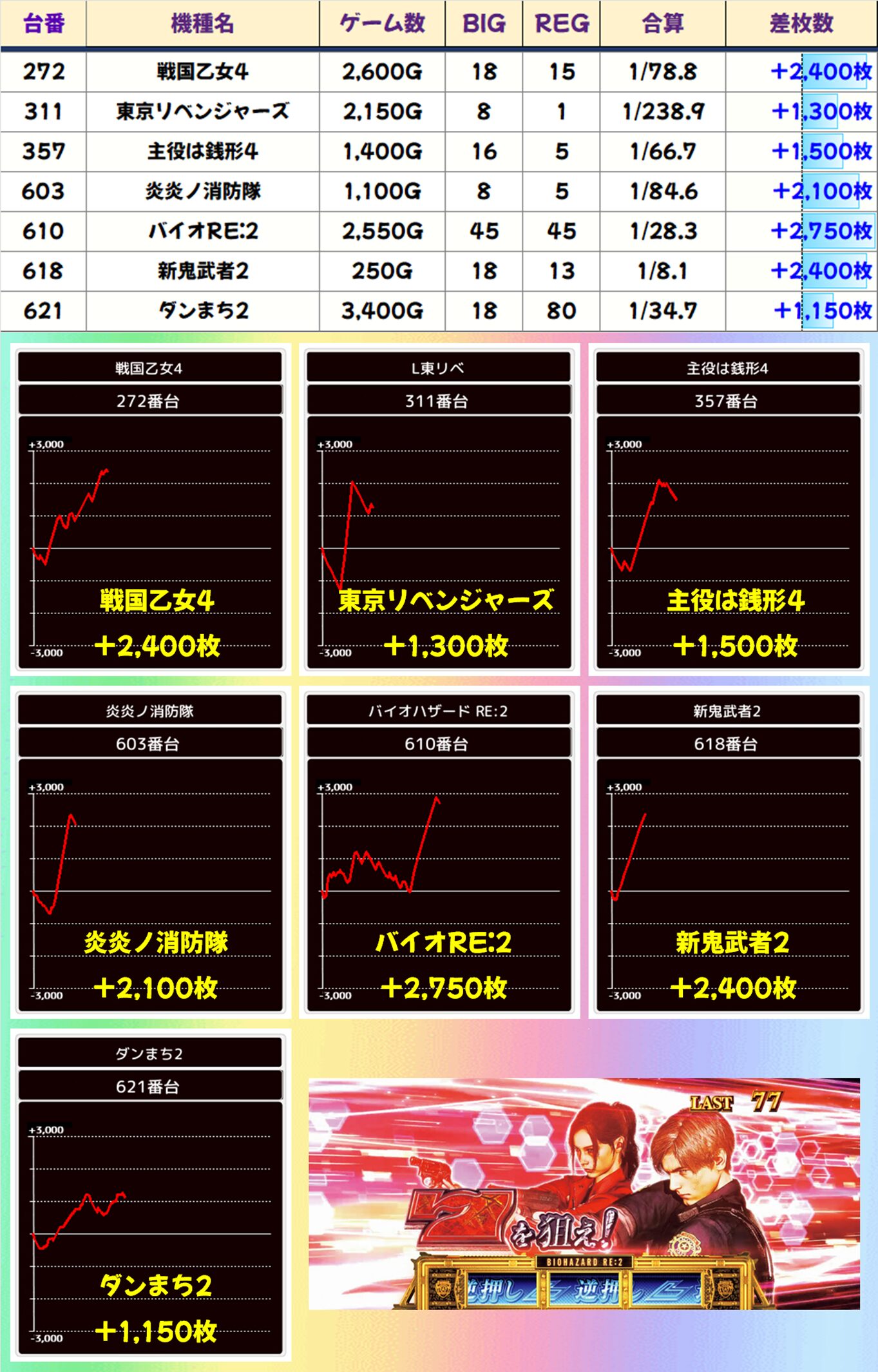 「バイオヴェンデッタ」はこれで⑥のつく日6回連続プラス差枚! 次回も超狙い目の機種なので入場番号1番を射止めたら「バイオヴェンデッタ」に直行しましょう!