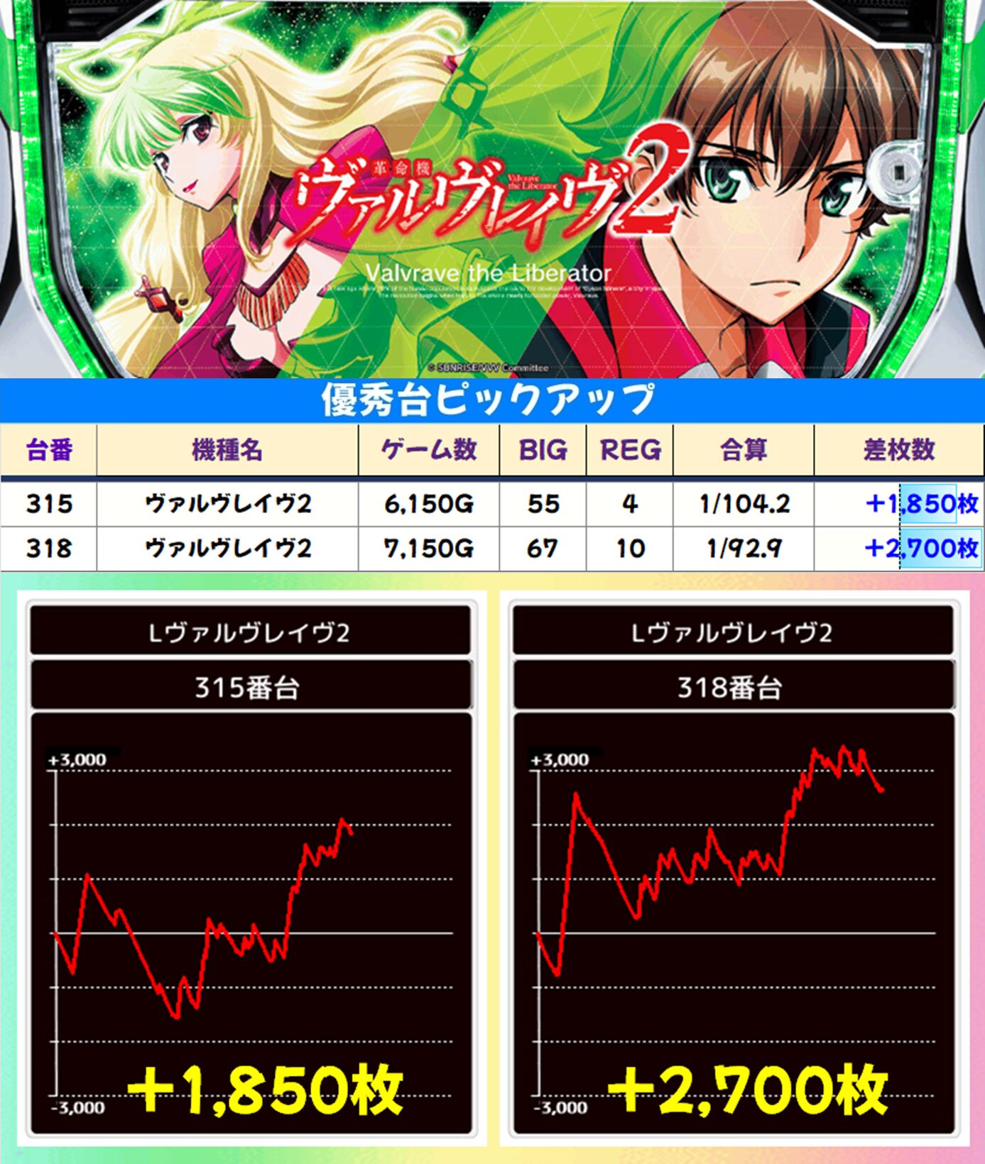 今回も多台数設置のメイン機種はもちろん、狙い目の少台数機種からも優秀台が続出しそうな予感! 最新台の「ヴァルヴレイヴ2」の仕掛けにも注目です!