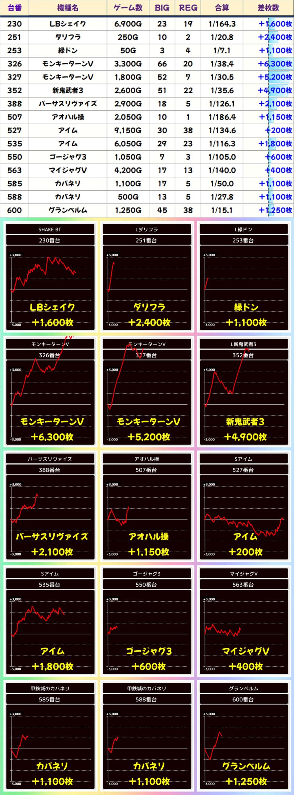 ⑥のつく日は単品も盛りだくさん。本日はメイン機種の「モンキーターン」から+6,300枚、+5,200枚、準新台の「新鬼武者3」から+4,900枚と大爆発台も複数出現! ジャグラーシリーズにもお宝台がありました。