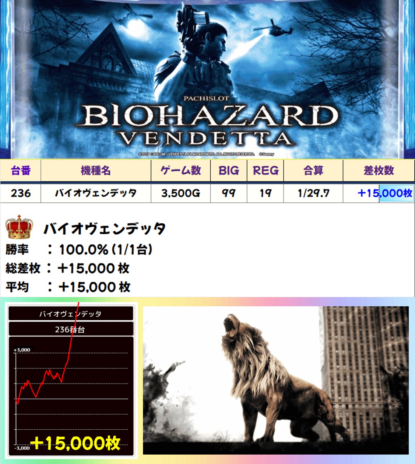 ⑥のつく日の「バイオヴェンデッタ」は鉄板! 本日は高設定とヒキが噛み合い大爆発! 15,000枚オーバーの出玉が炸裂しました!