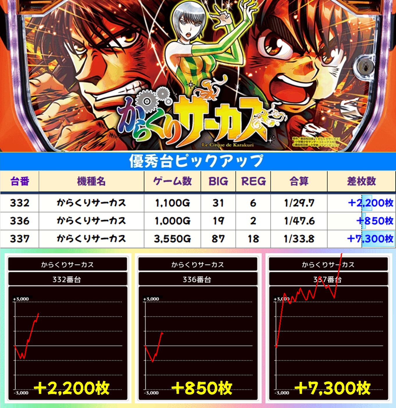 5台設置の「からくりサーカス」が高配分。結果は総差枚+8,300枚、平均差枚+1,660枚で3台がプラス差枚。盤石の展開で出玉を伸ばした337番台が7,000枚を超える出玉を獲得しました!