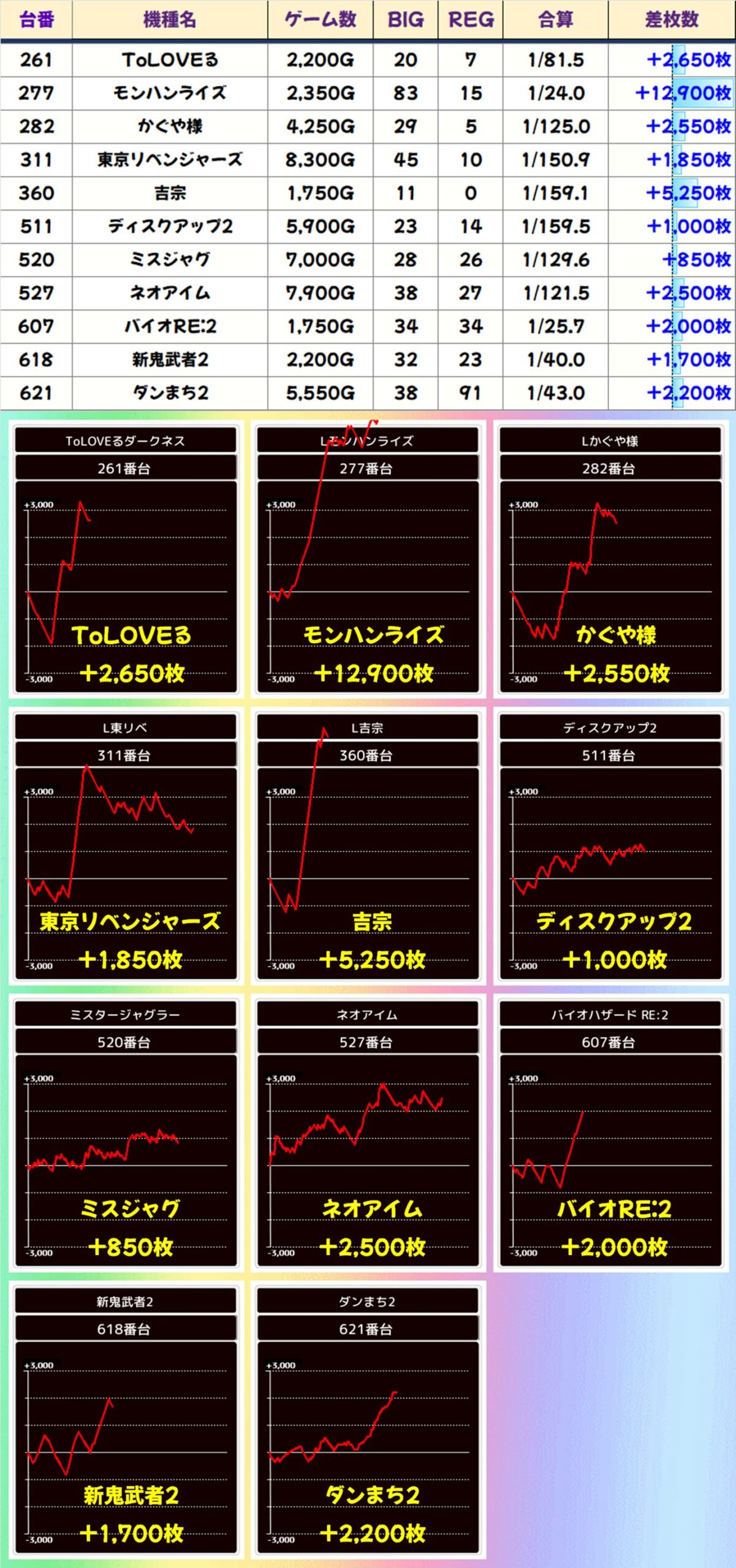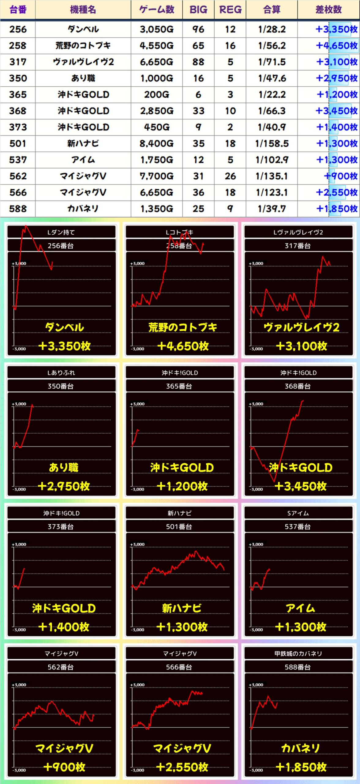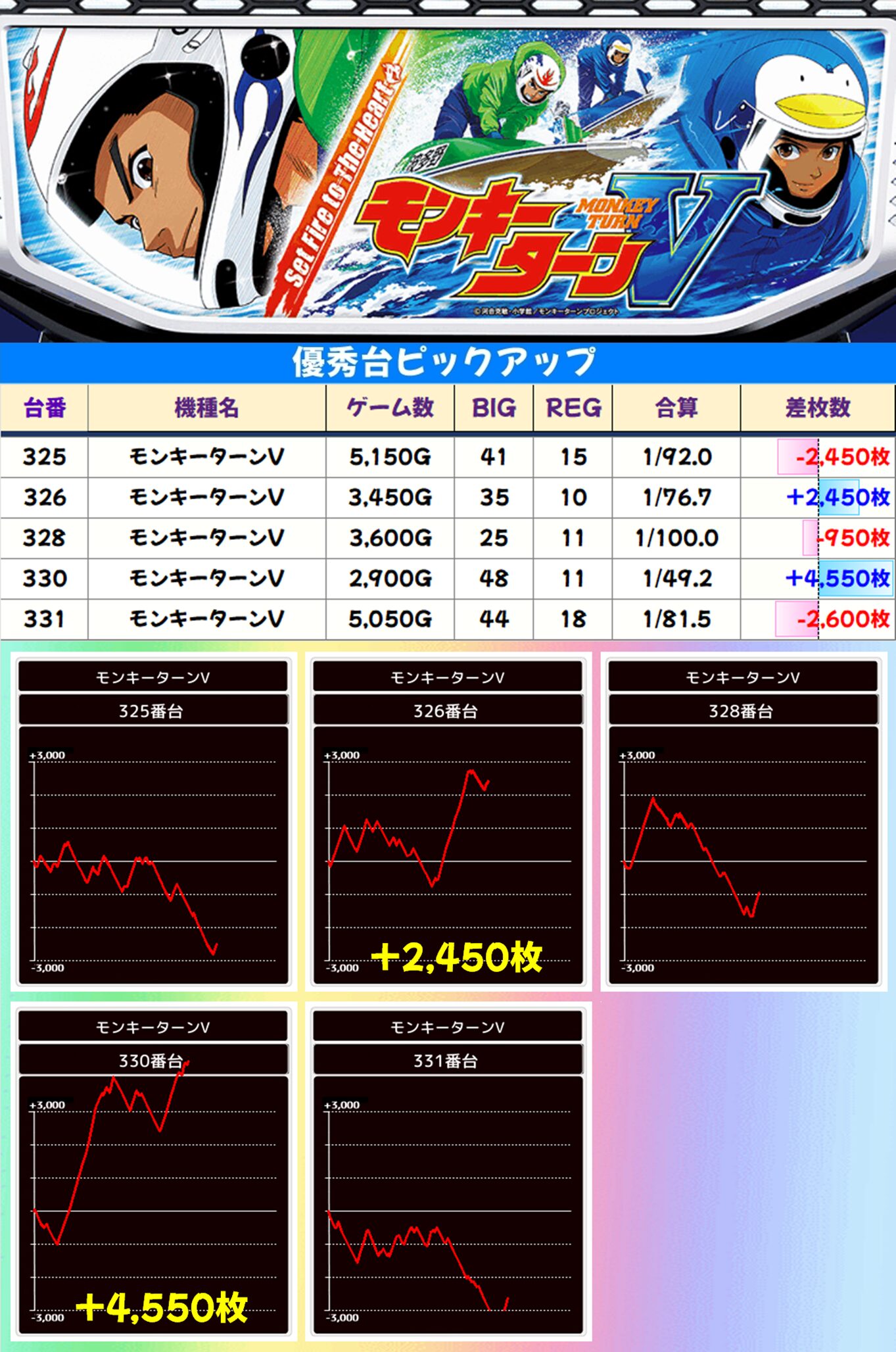 「モンキーターンV」も高配分。+4,550枚、+2,450枚と2台が優秀な成績を収めましたが、残念ながら不発台が多かった…。⑥のつく日は多台数設置のメイン機種にもお宝台が多いので、打つ台に迷ったらメイン機種をチェックしてみてください。