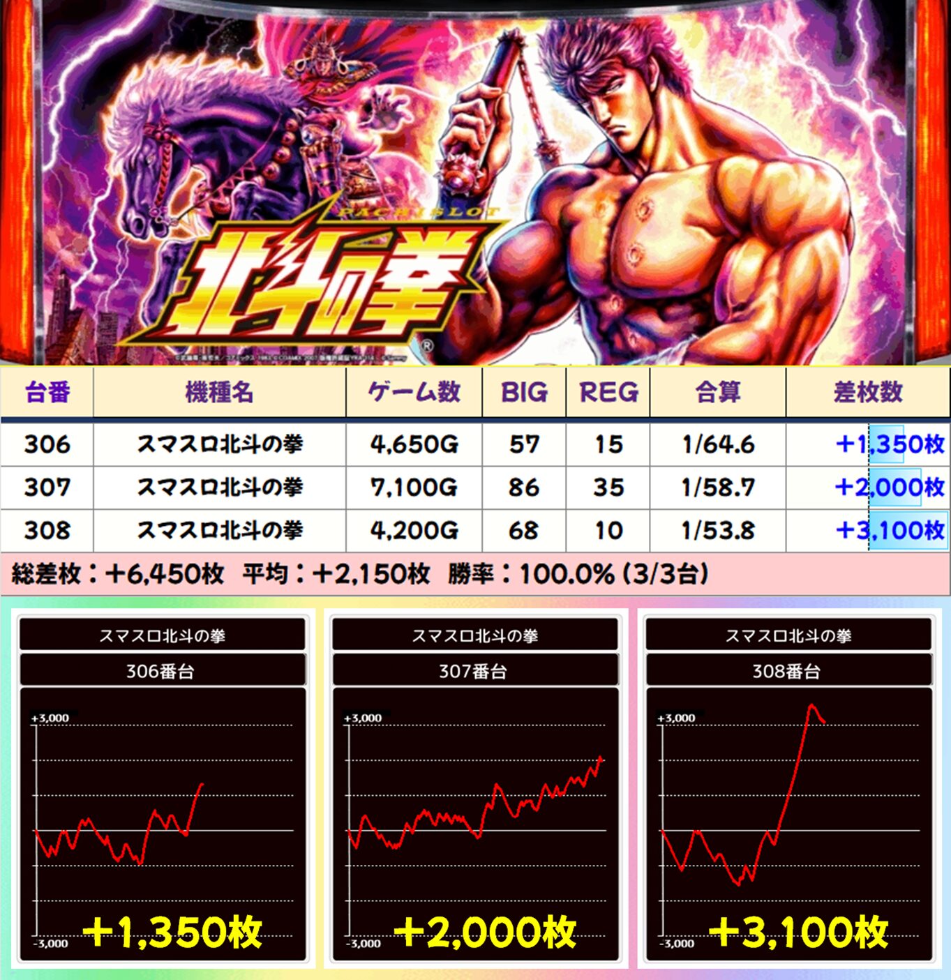 「スマスロ北斗の拳」には3台並びの仕掛けも! 3台並びは平均差枚+2,150枚で全台プラス差枚。初当り35回の307番台は最高設定だったと思われるので、高品質な3台並びの仕掛けでした!