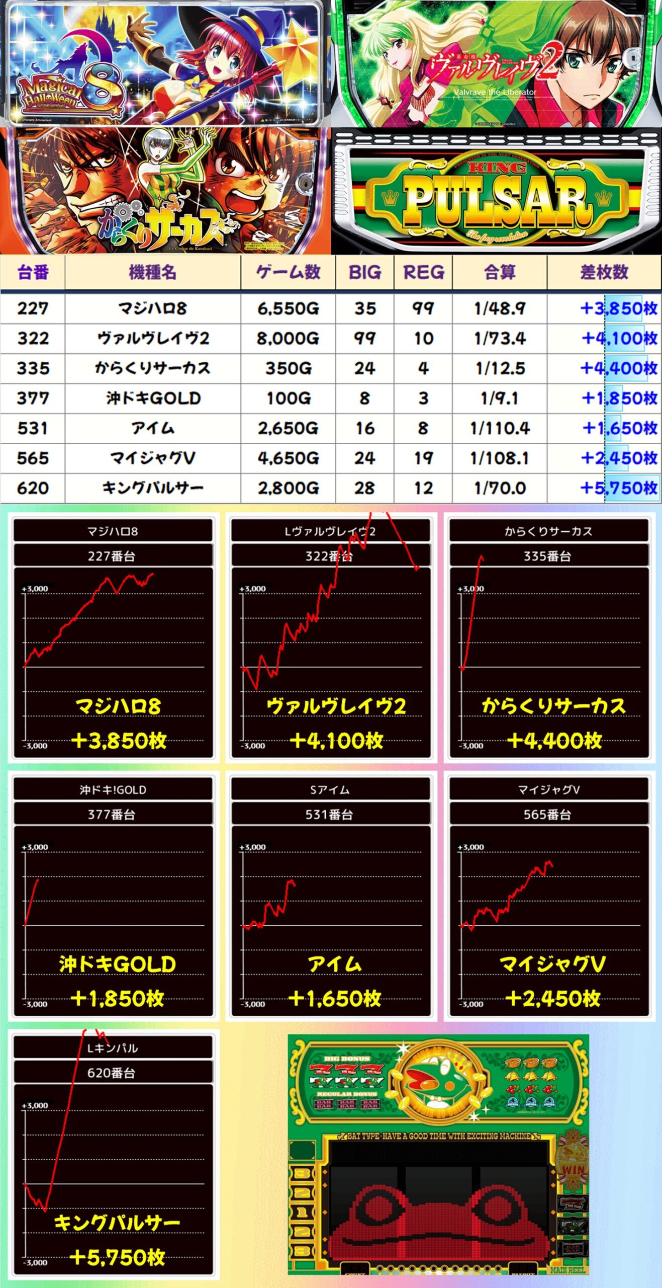 ⑥のつく日は単品も盛りだくさん。「キングパルサー」から+5,750枚、「からくりサーカス」から+4,400枚、「ヴァルヴレイヴ2」から+4,100枚と大爆発台も複数出現しました!