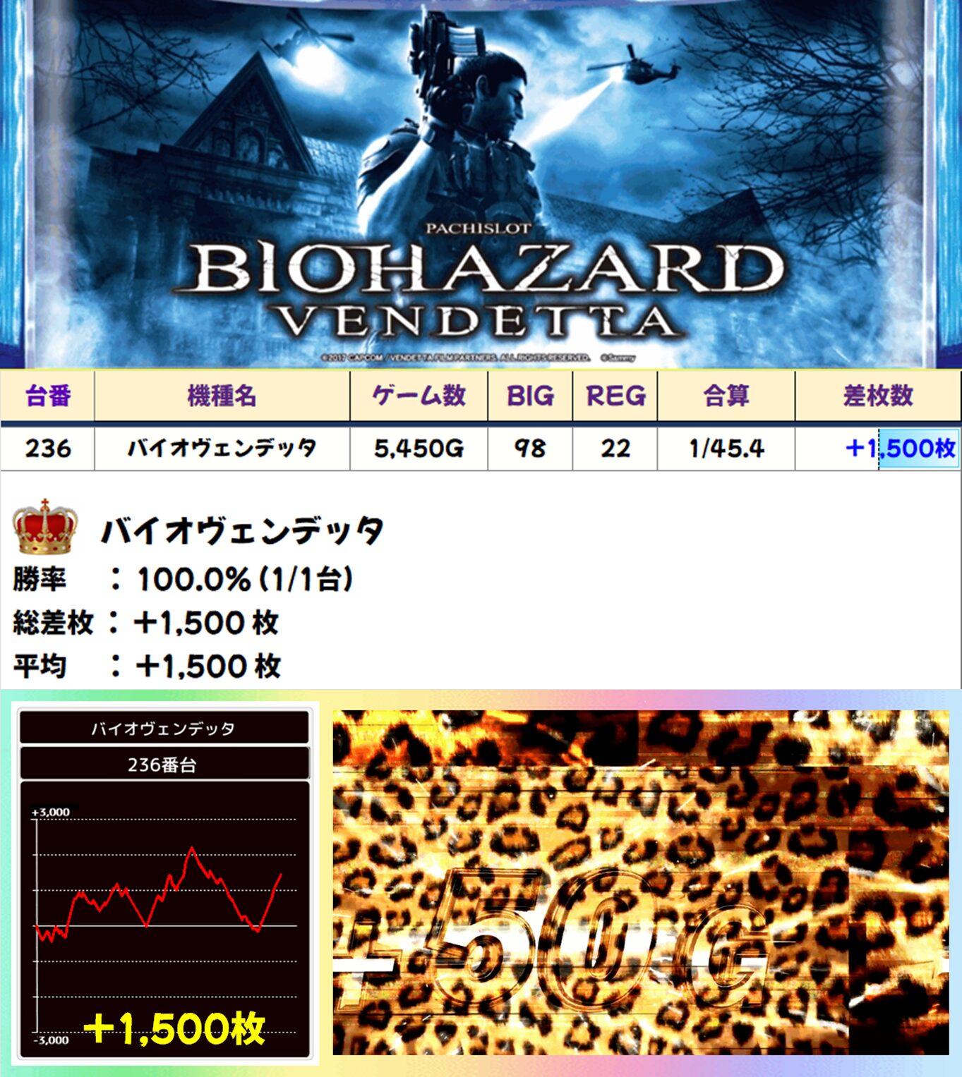 ⑥のつく日7連勝中の「バイオヴェンデッタ」が本日もしっかりプラス! +1,500枚で見事8連勝を達成しました!