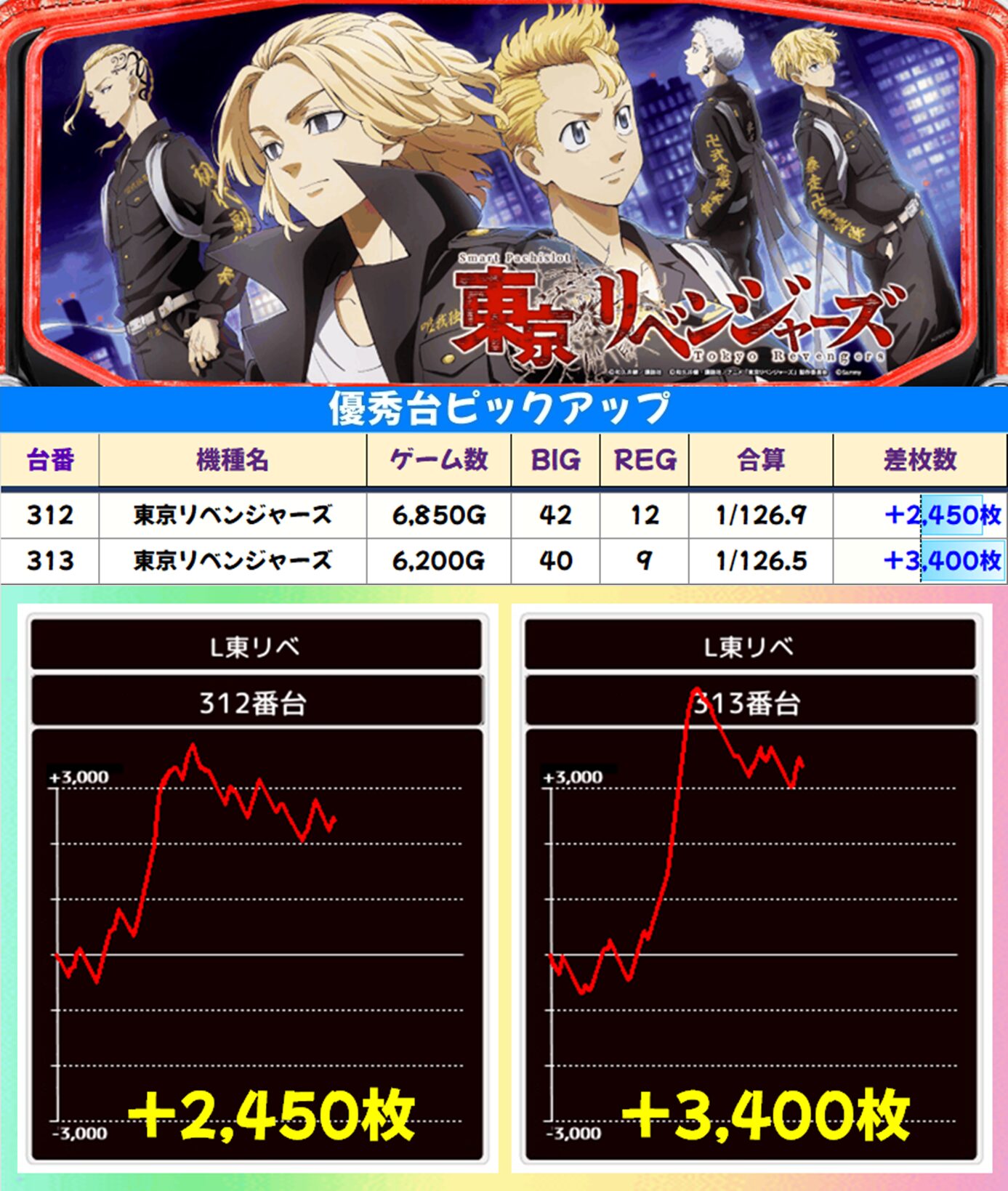 「モンハンライズ」は不発気味の結果でしたが「東京リベンジャーズ」と「モンキーターンV」には複数の優秀台が! 4台が1,500枚以上の出玉を獲得しました。