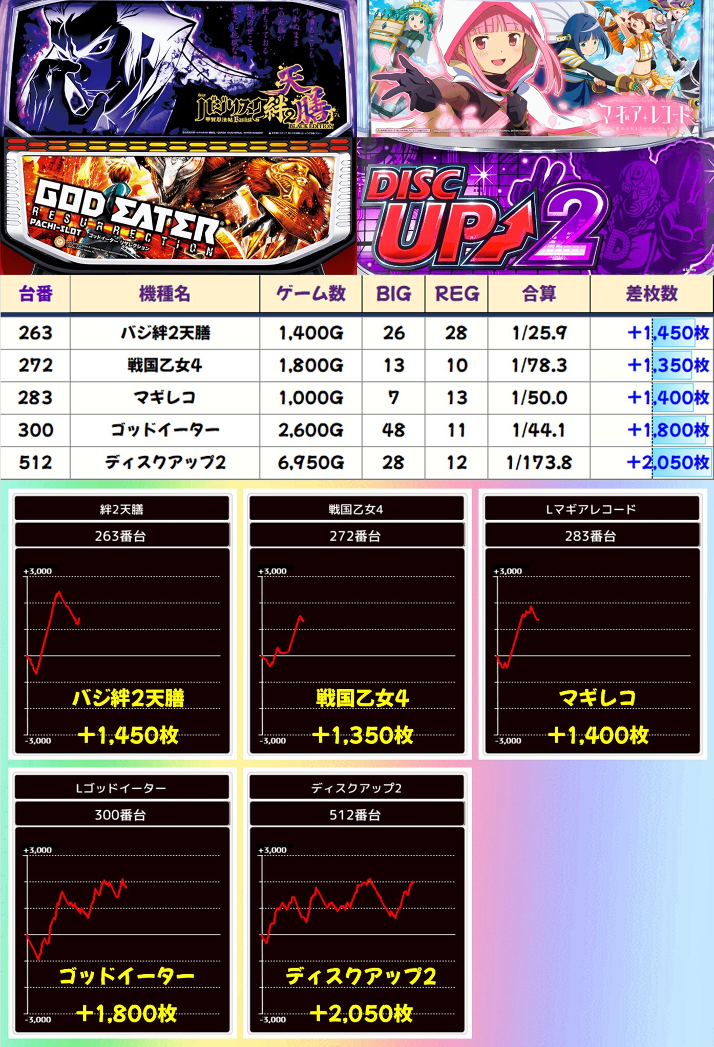 ⑥のつく日は少台数機種が狙い目! 本日も少台数機種から優秀台が多数出現しました。