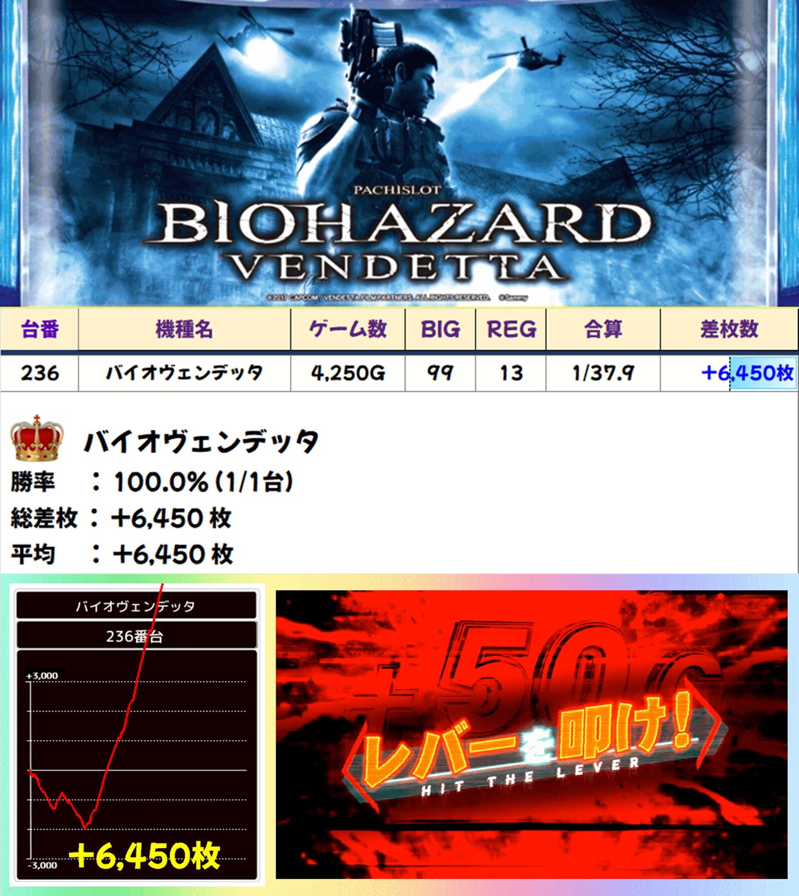 2026年も⑥のつく日は「バイオヴェンデッタ」! 本日の「バイオヴェンデッタ」は中盤から一気に出玉を伸ばし+6,450枚の大勝利! これで⑥のつく日の「バイオヴェンデッタ」は12連勝を達成しました!