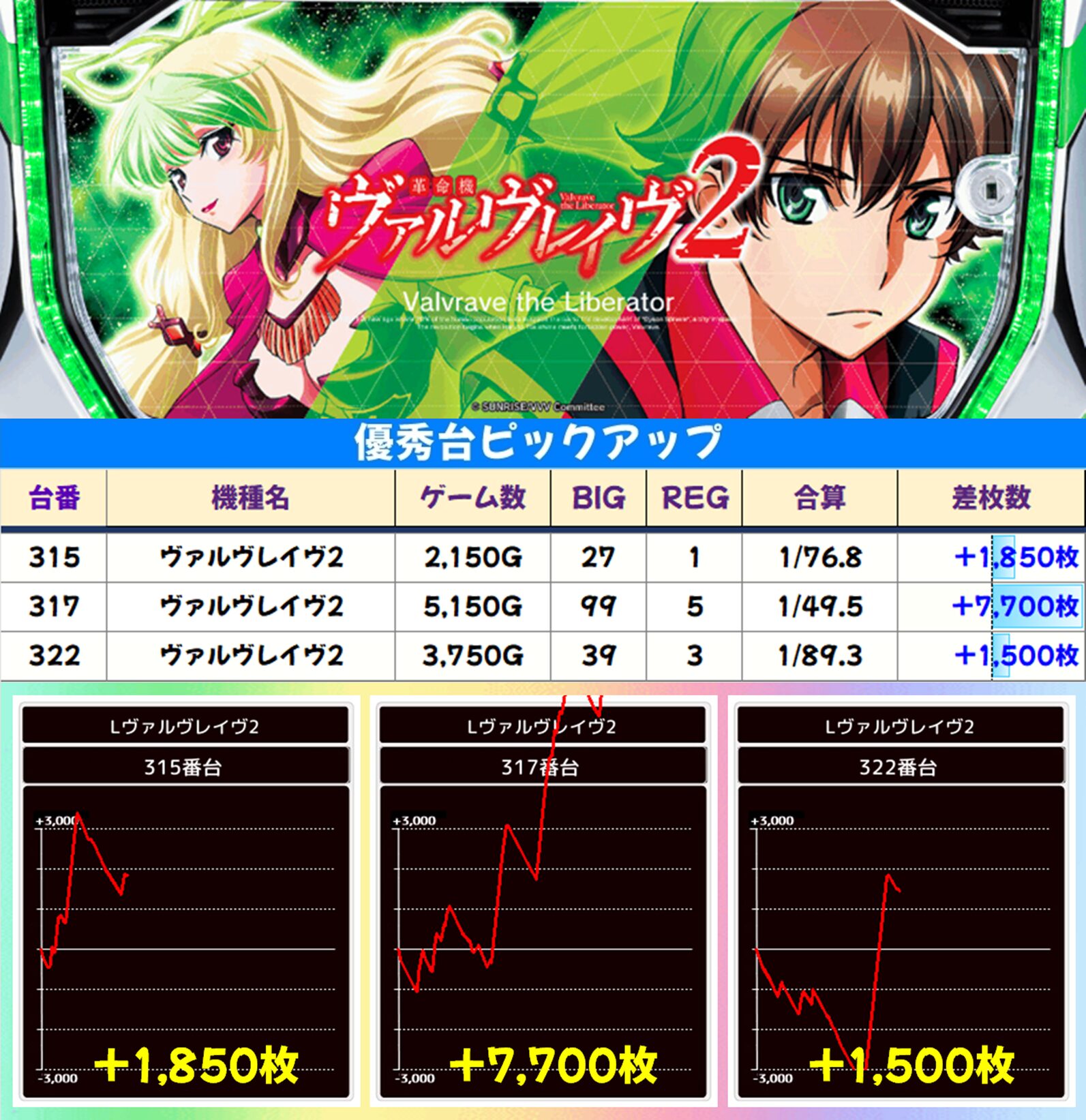 今回は「ヴァルヴレイヴ2」から大爆発台が出現! 317番台が7,000枚を超える大量出玉を獲得しました。