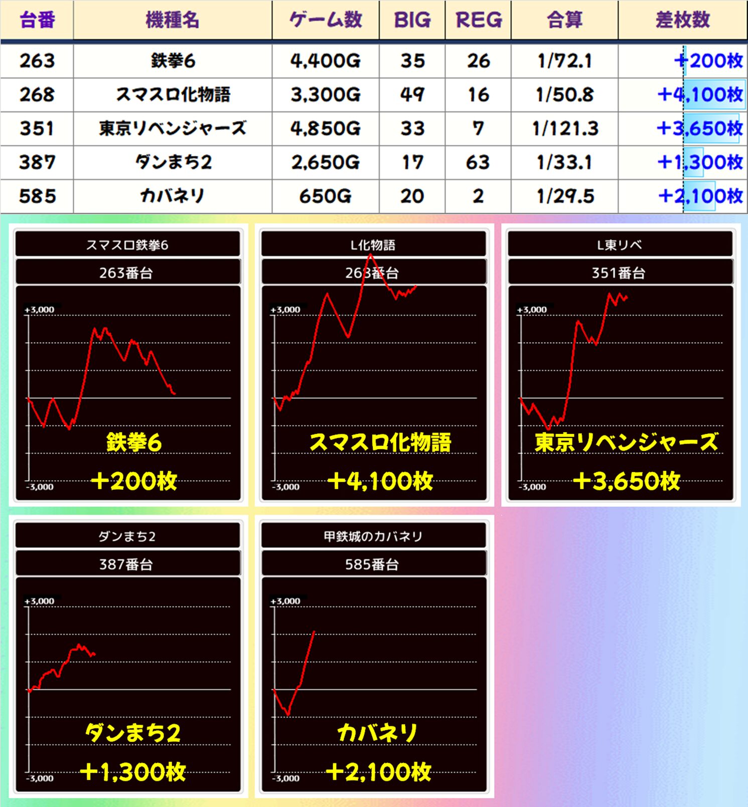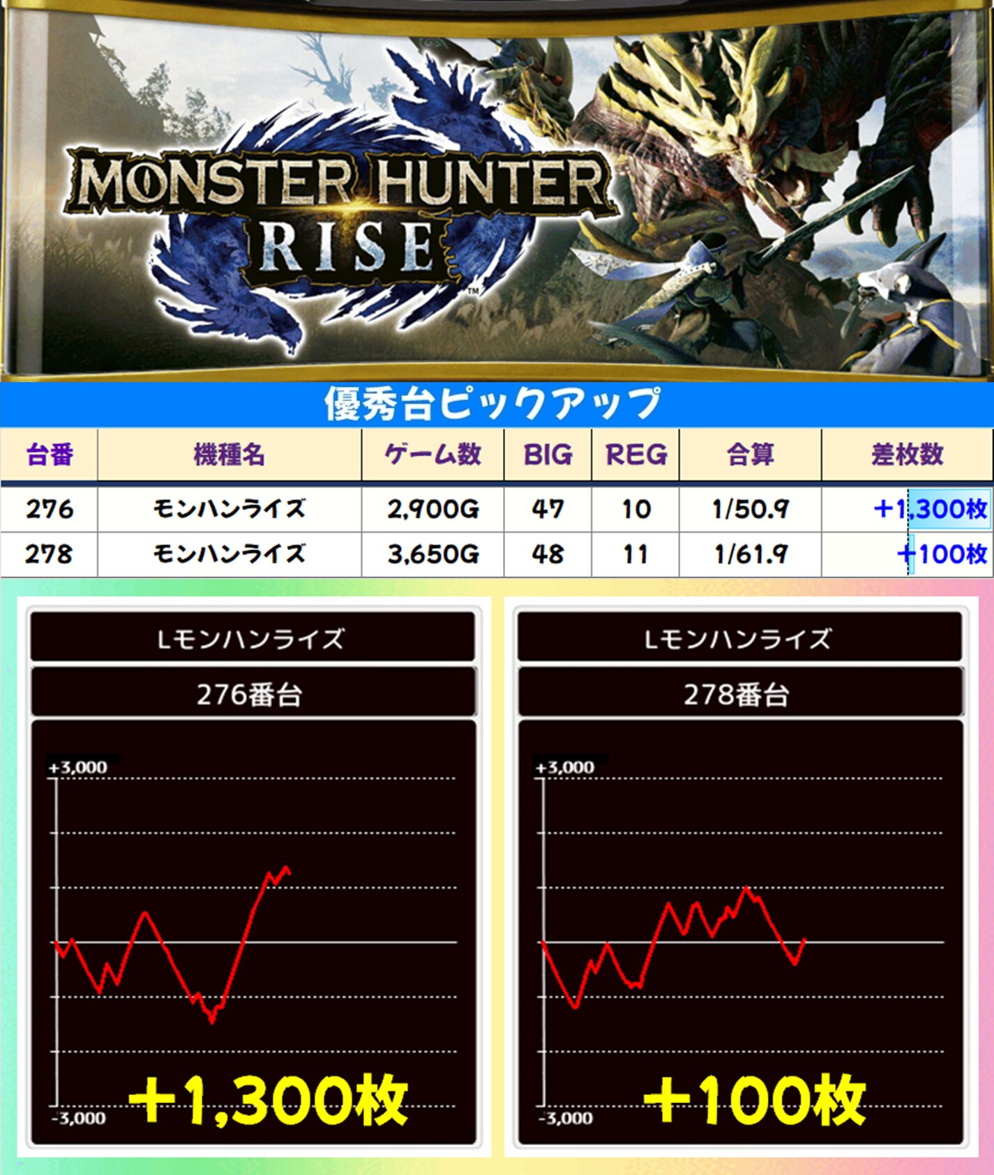 本日は3台設置の「モンハンライズ」が高配分でしたが、その他の2~3台設置機種にも多数のお宝台が! 「スマスロ化物語」から+4,100枚、「東京リベンジャーズ」から+3,650枚と大量出玉獲得台も複数出現! 最新台の「鉄拳6」にもしっかりお宝台がありましたね。
