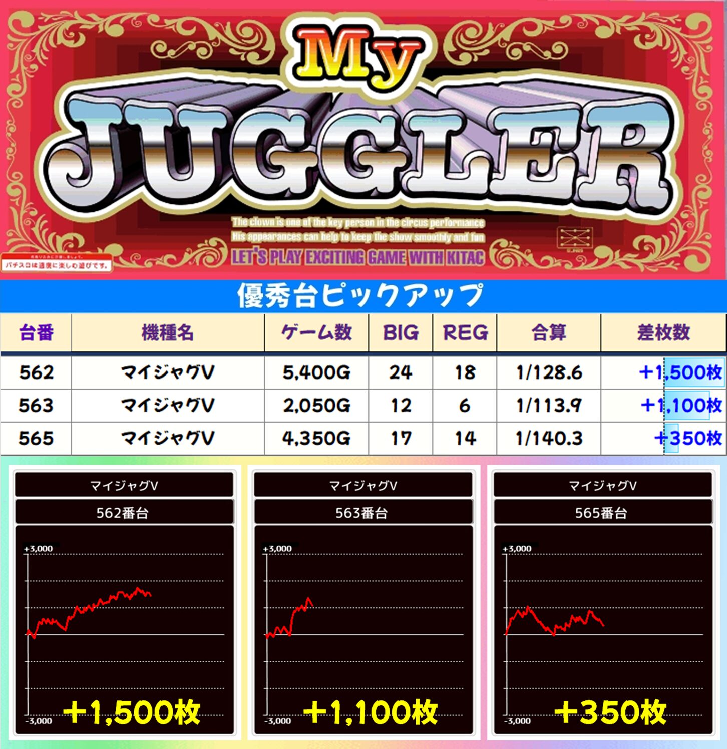 本日は「マイジャグV」が高配分、その他のジャグラーにもしっかり高設定が! ⑥のつく日は手堅くジャグラー勝負もありですよ。