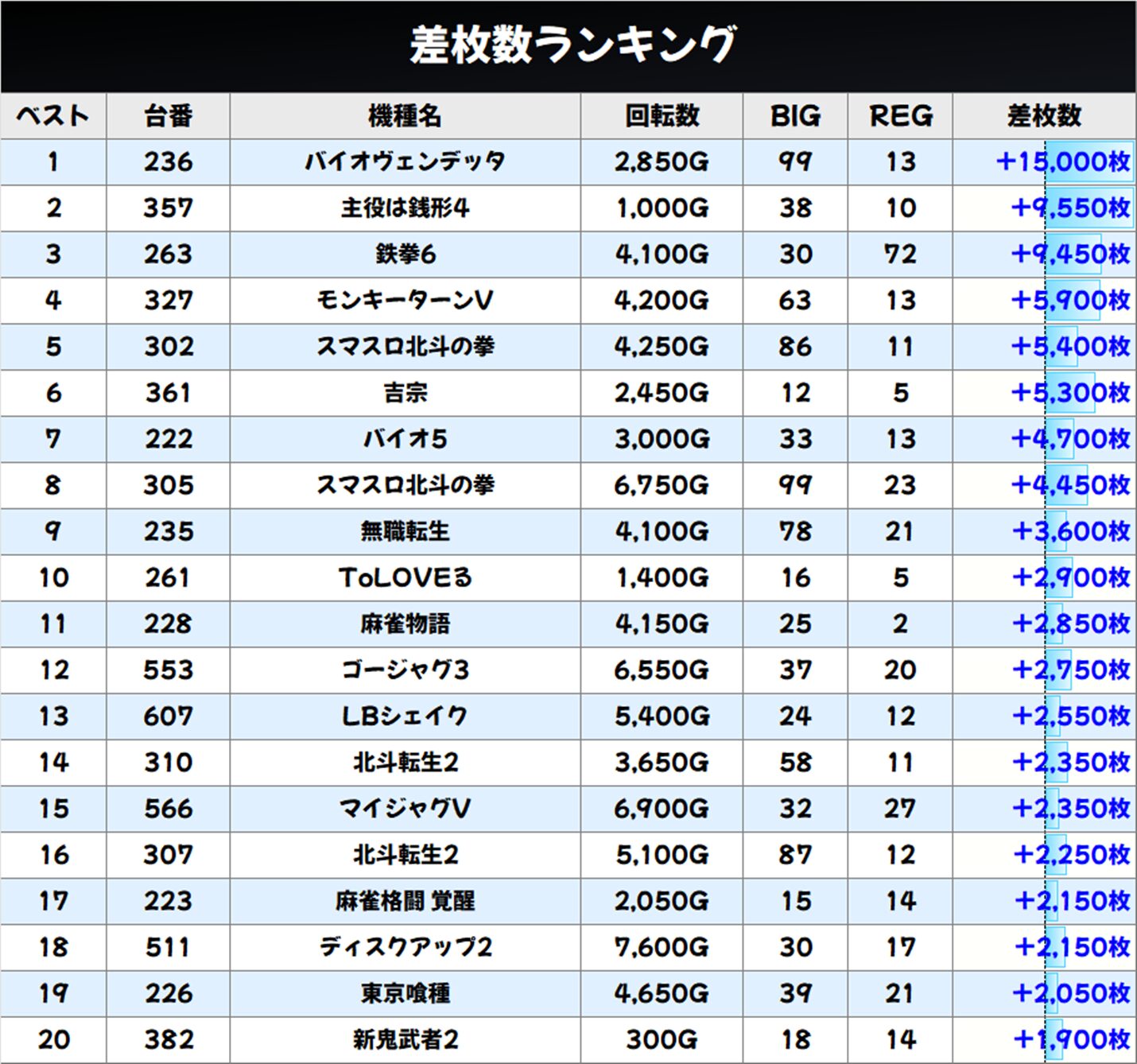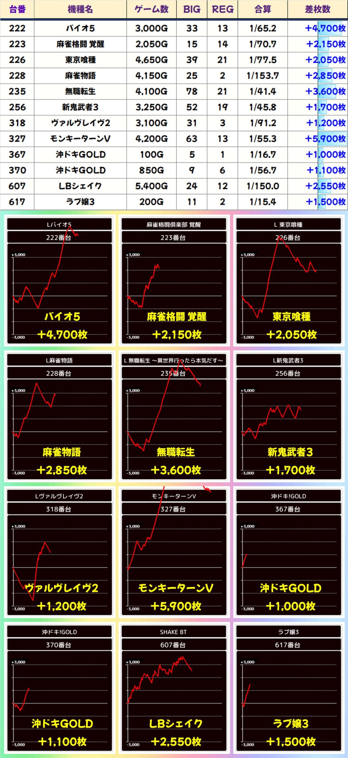 今回も多台数設置機種から少台数機種までお宝機種が散りばめられているはず! ⑥のつく日の連勝がストップしてしまった鉄板の「バイオヴェンデッタ」の結果も気になるところです。