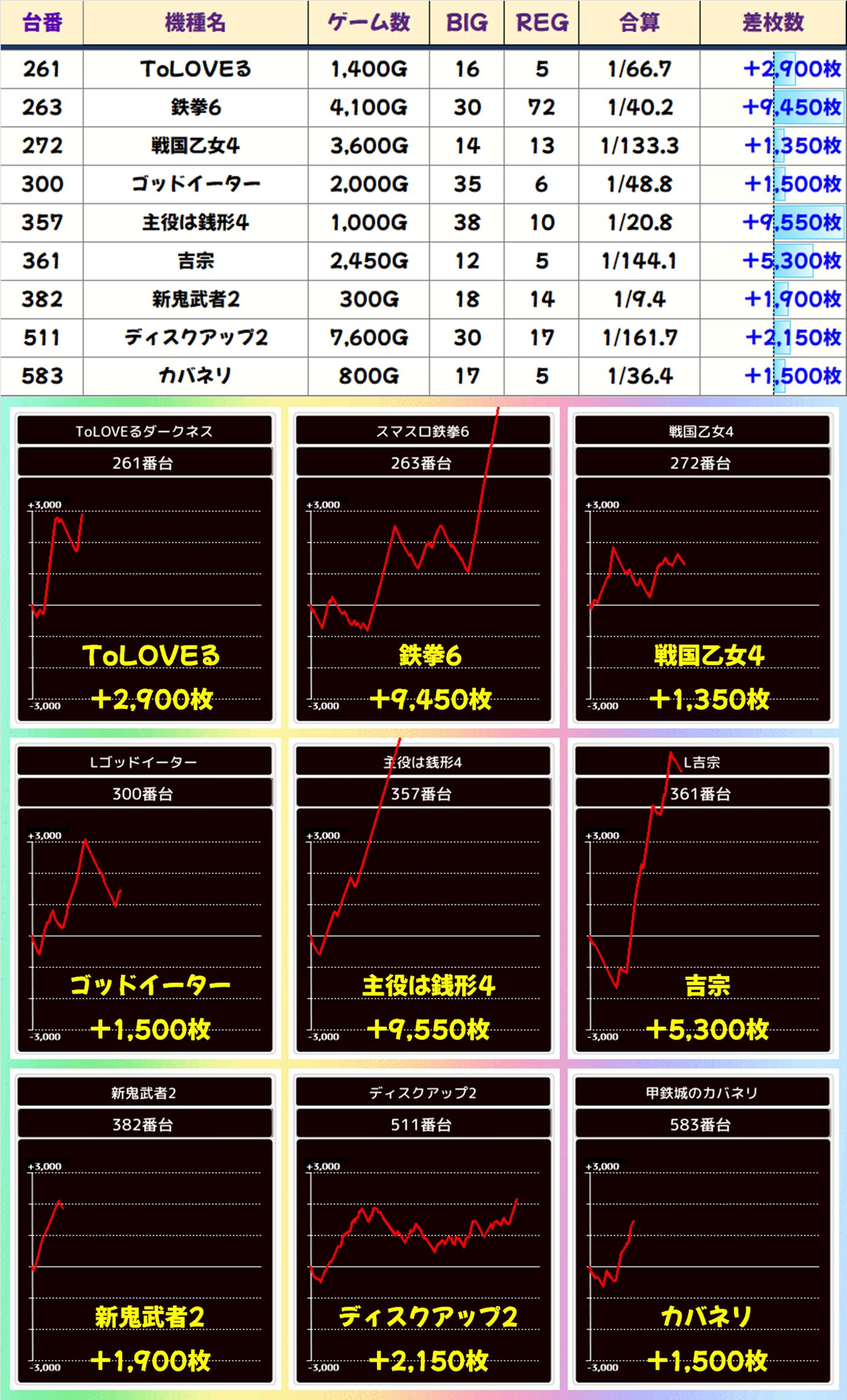 本日も2~3台設置機種にもお宝台多数。「主役は銭形4」から+9,550枚、「鉄拳6」から+9,450枚、「吉宗」から+5,300枚と大爆発台も複数出現しました。