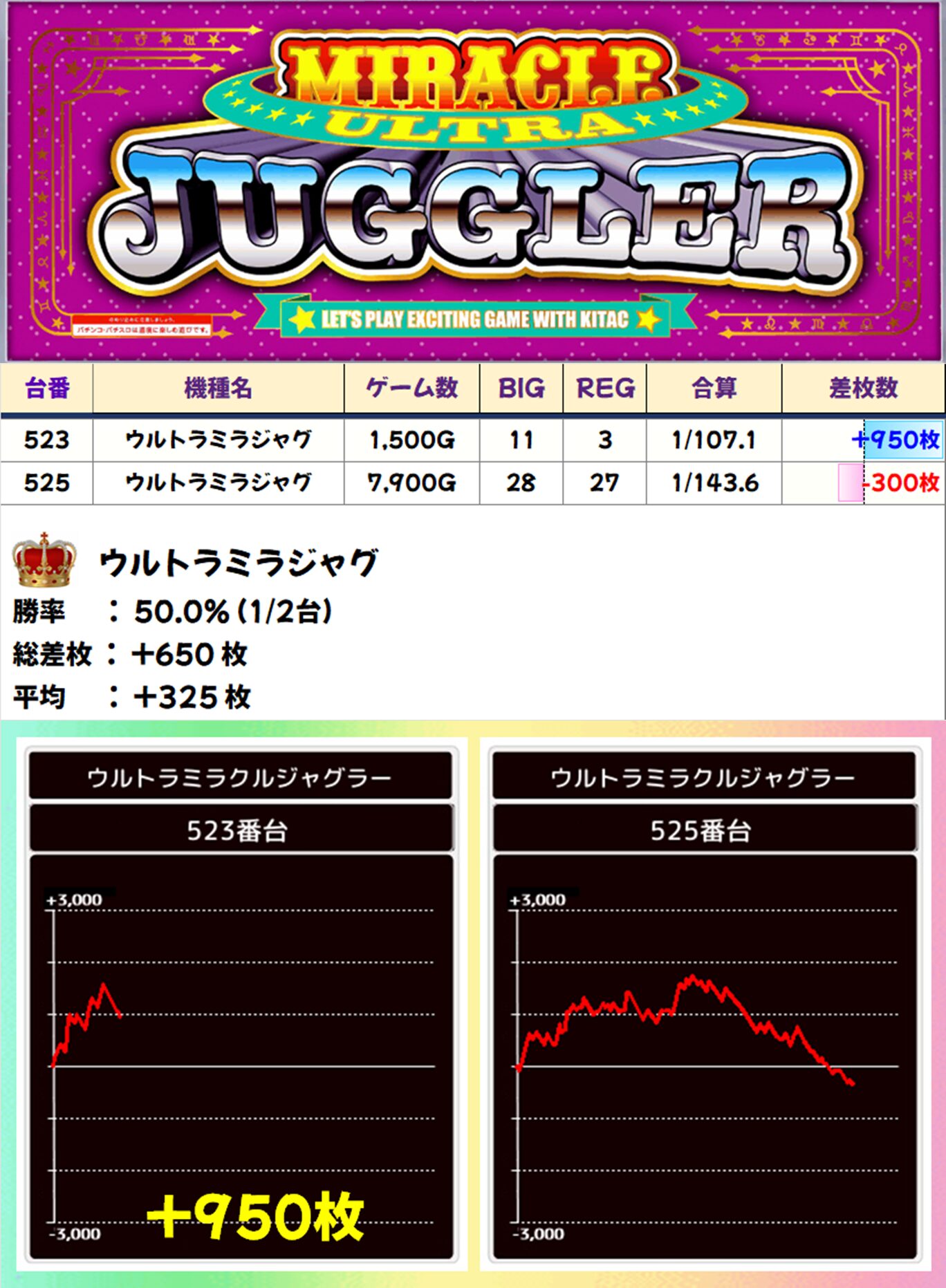 ⑥のつく日はジャグラーシリーズも抜かりナシ! 本日は「ウルトラミラジャグ」と「ミスタージャグラー」が高配分。「ウルトラミラジャグ」は全台系だったかも? その他のジャグラーにもしっかりお宝台がありました。