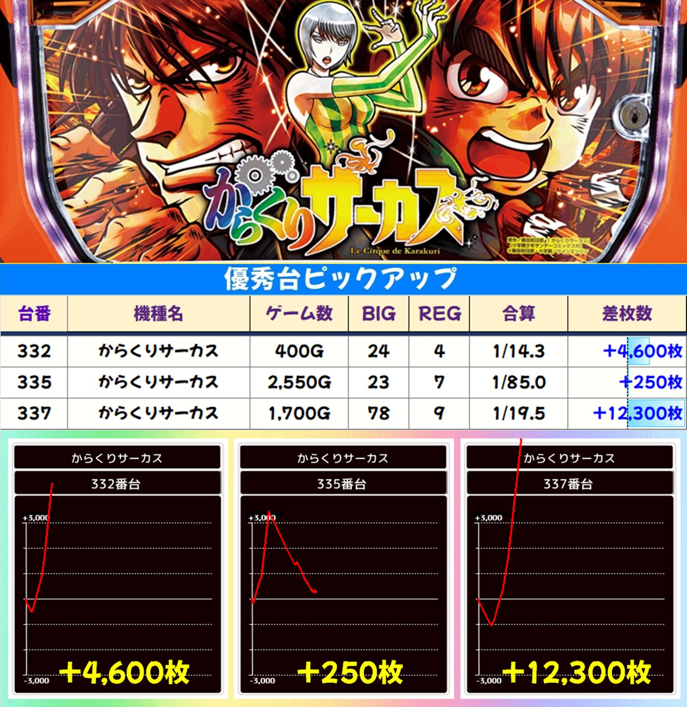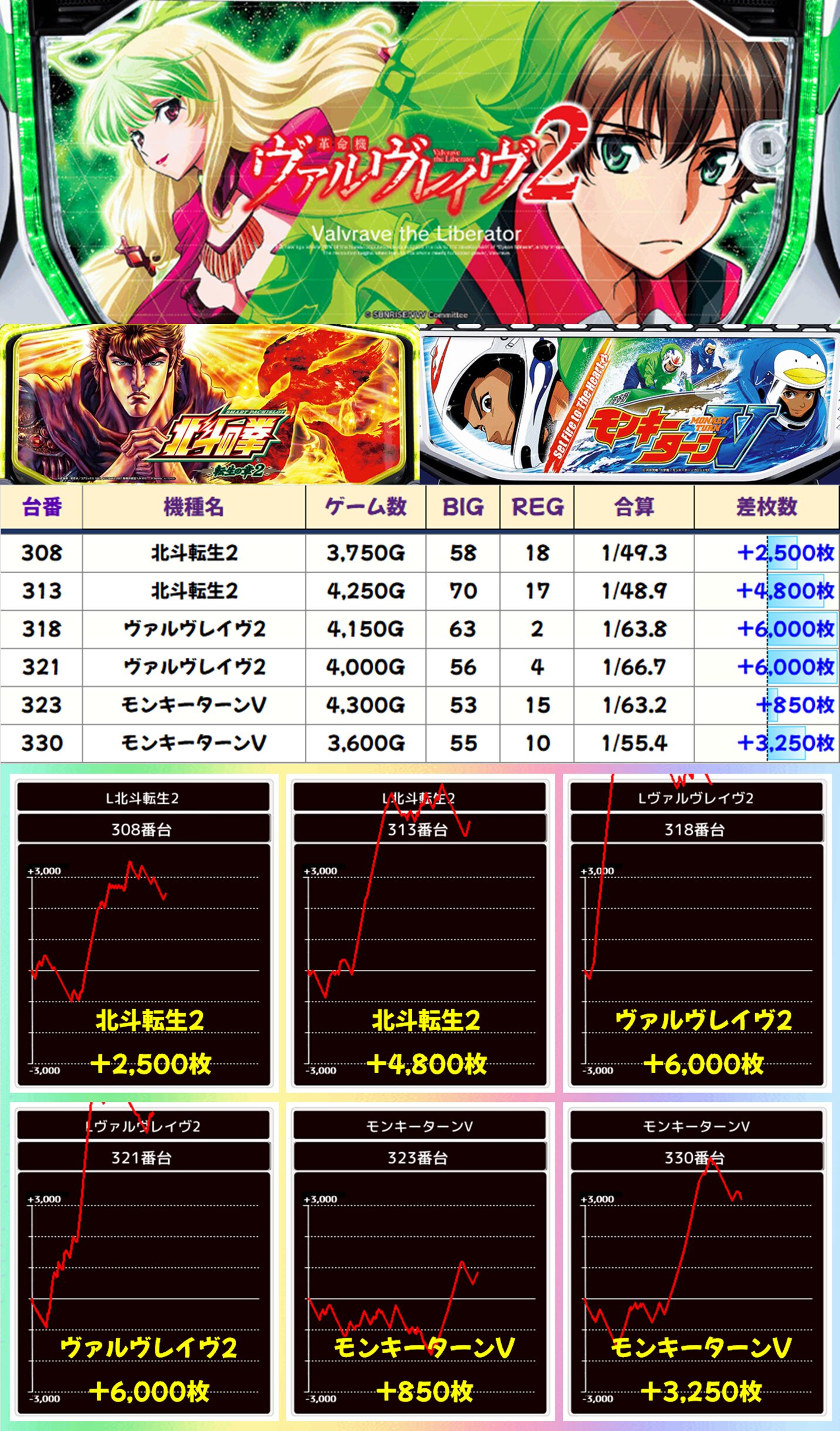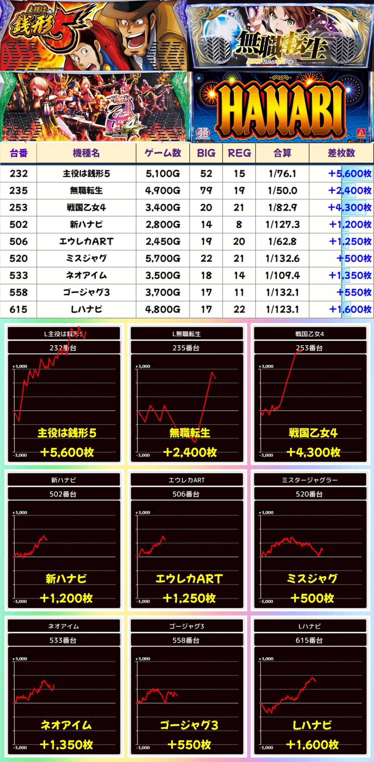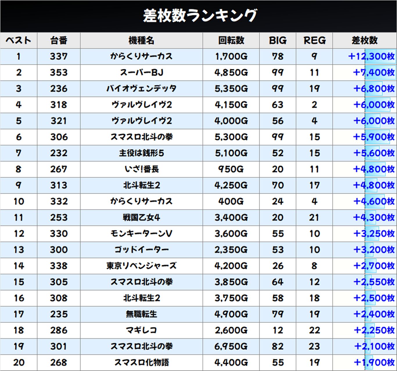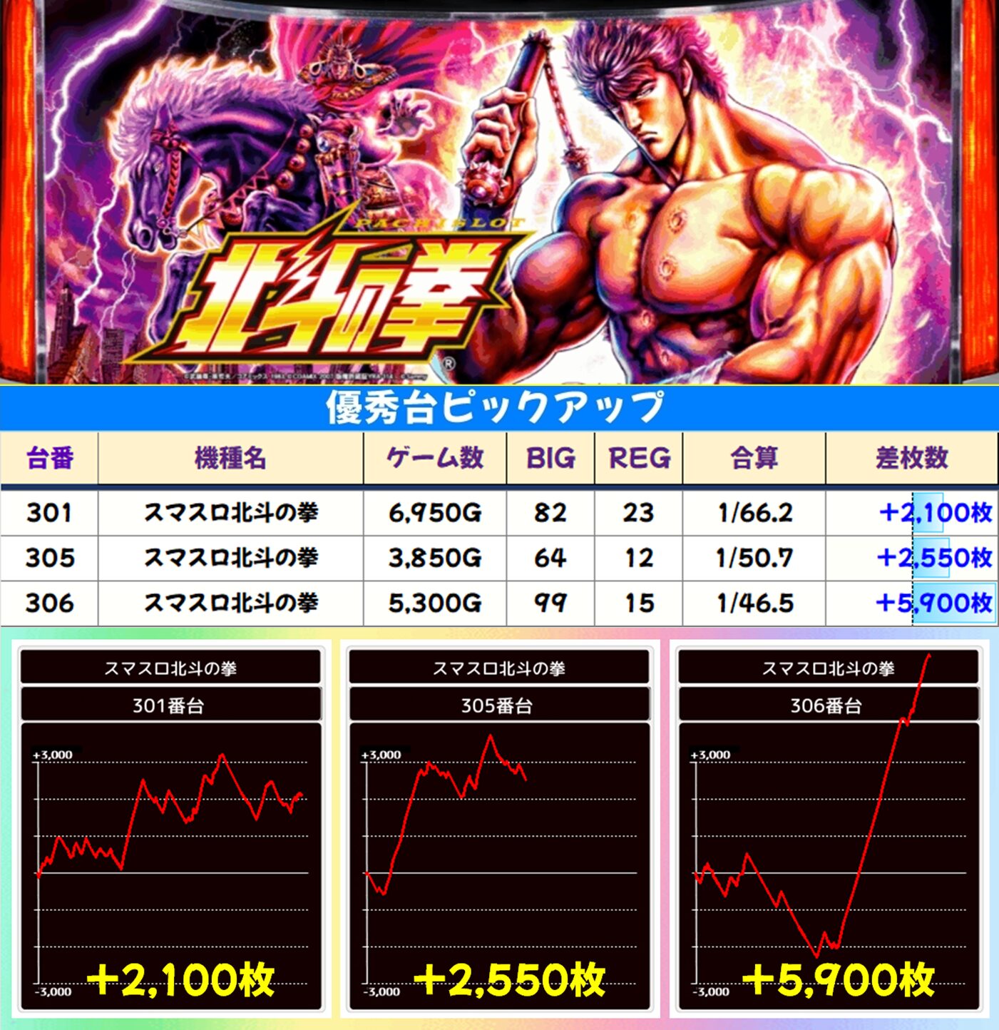 高品質な仕掛けだったので、3機種とも平均差枚+1,000枚以上! 「からくりサーカス」から+12,300枚、+4,600枚、「スマスロ北斗の拳」から+5,900枚と大爆発台も複数出現しました。