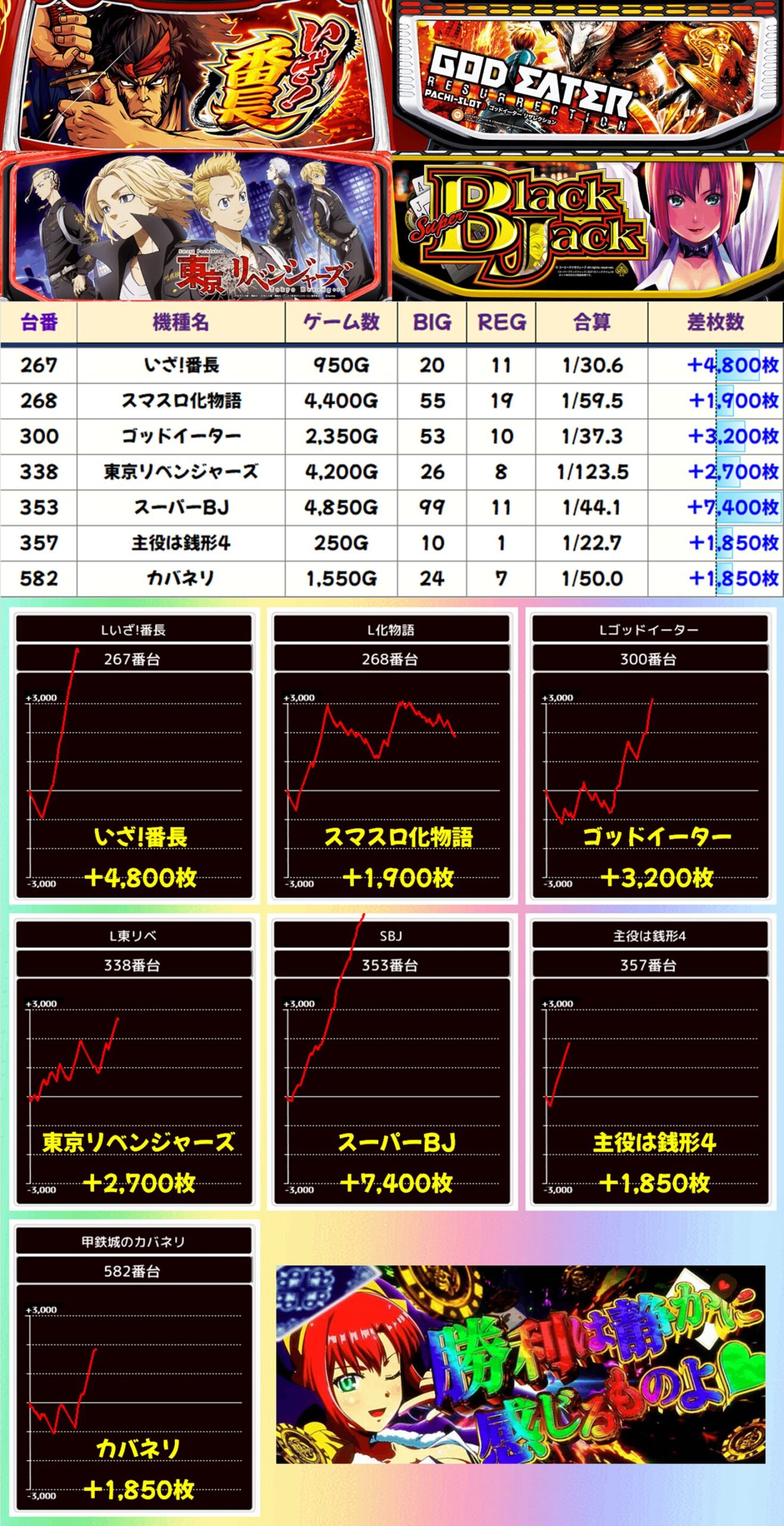本日も2~3台設置機種に多数のお宝台が! 「スーパーBJ」から+7,400枚、「いざ!番長」から+4,800枚、「ゴッドイーター」から+3,200枚、「東京リベンジャーズ」から+2,700枚と大量出玉獲得台も複数出現しました。