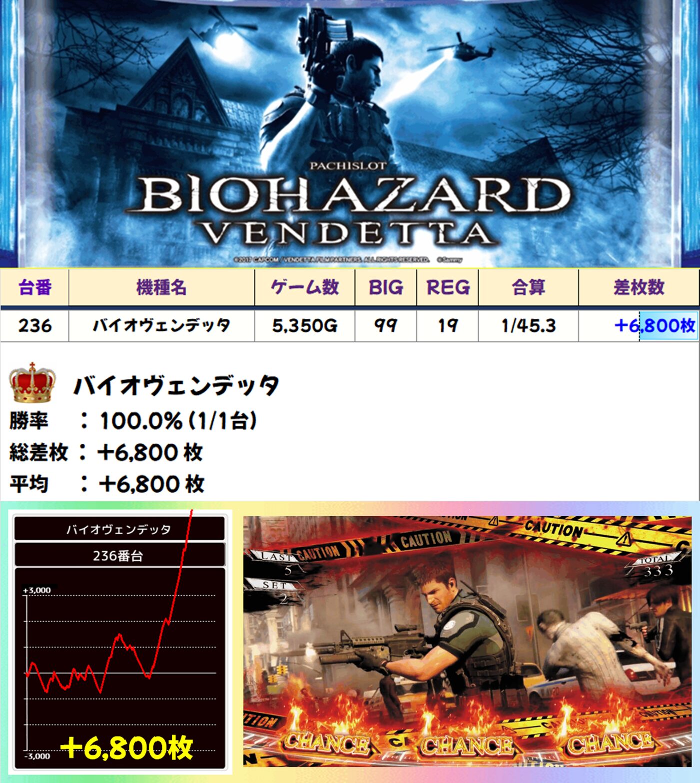 ⑥のつく日は「バイオヴェンデッタ」が鉄板! 本日も終盤に一気に出玉を伸ばし+6,800枚の大爆発! これで⑥のつく日2連勝! この勢いのまま連勝街道を突っ走りそうですね。