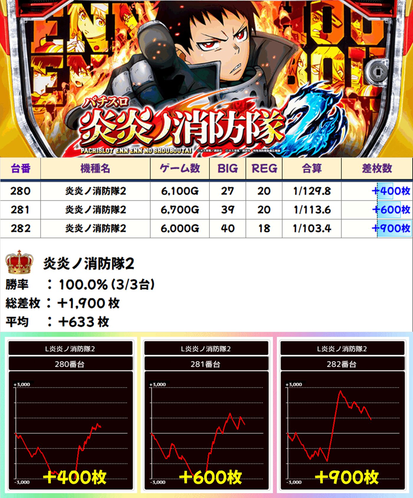 「炎炎ノ消防隊2」は3台とも一撃3,000枚以上の見せ場アリ! 「北斗転生2」は3台が1,500枚以上の出玉を獲得して勝利を収めました。