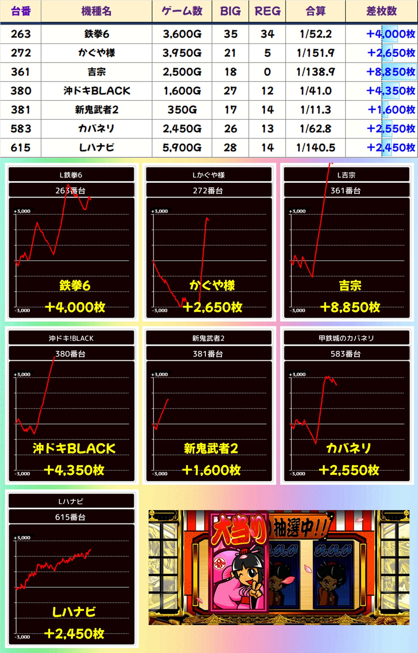 本日も2~3台設置機種にお宝台多数! 「吉宗」から+8,850枚、「沖ドキBLACK」から+4,350枚、「鉄拳6」から+4,000枚と大量出玉獲得台も複数出現しました。