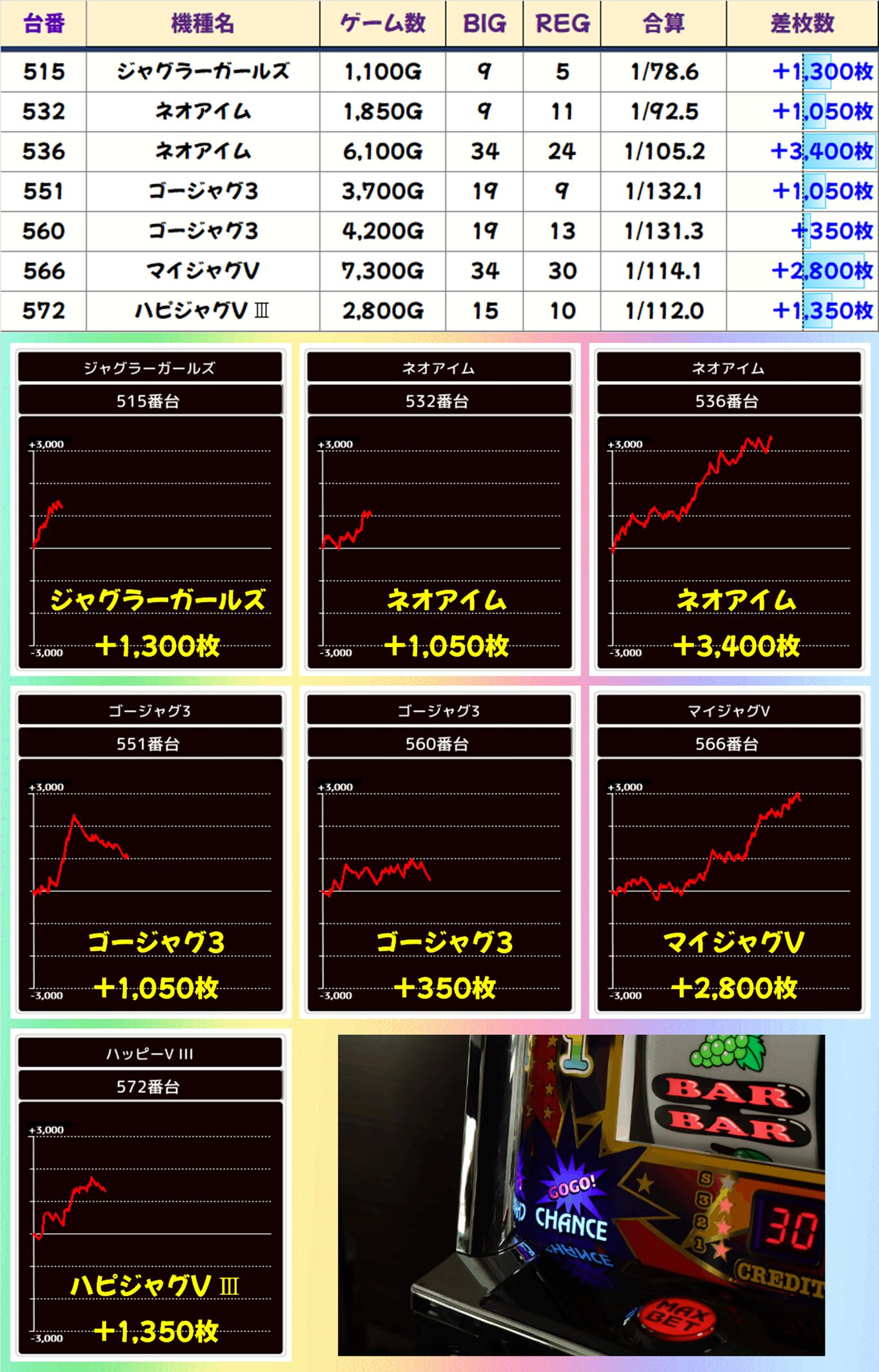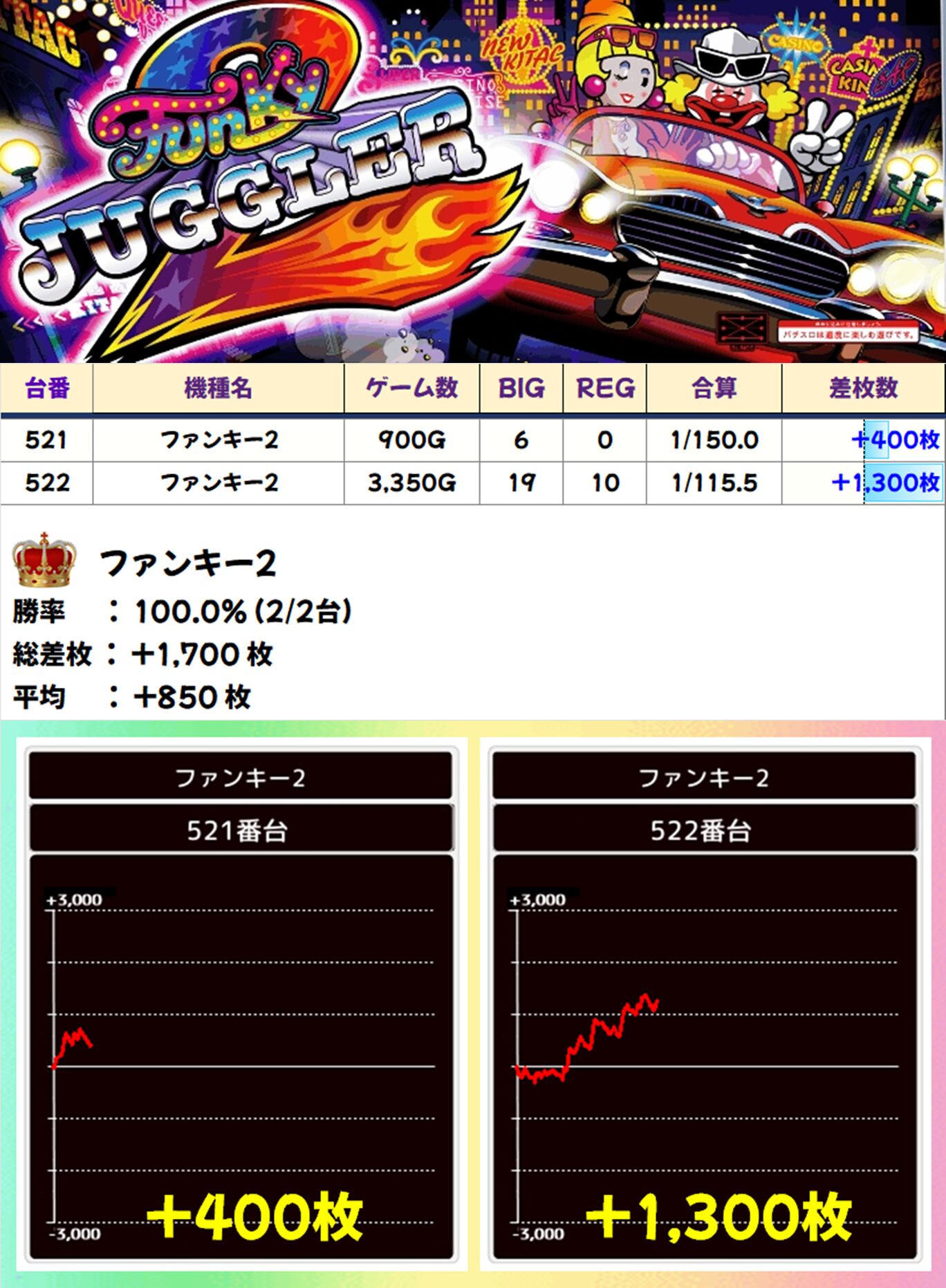 ⑥のつく日はジャグラーの扱いも◎! 本日は「ファンキー2」が高配分、その他のジャグラーにもしっかりお宝台が! ジャグラーの状況も良いので、手堅く勝つならジャグラー勝負がオススメです!