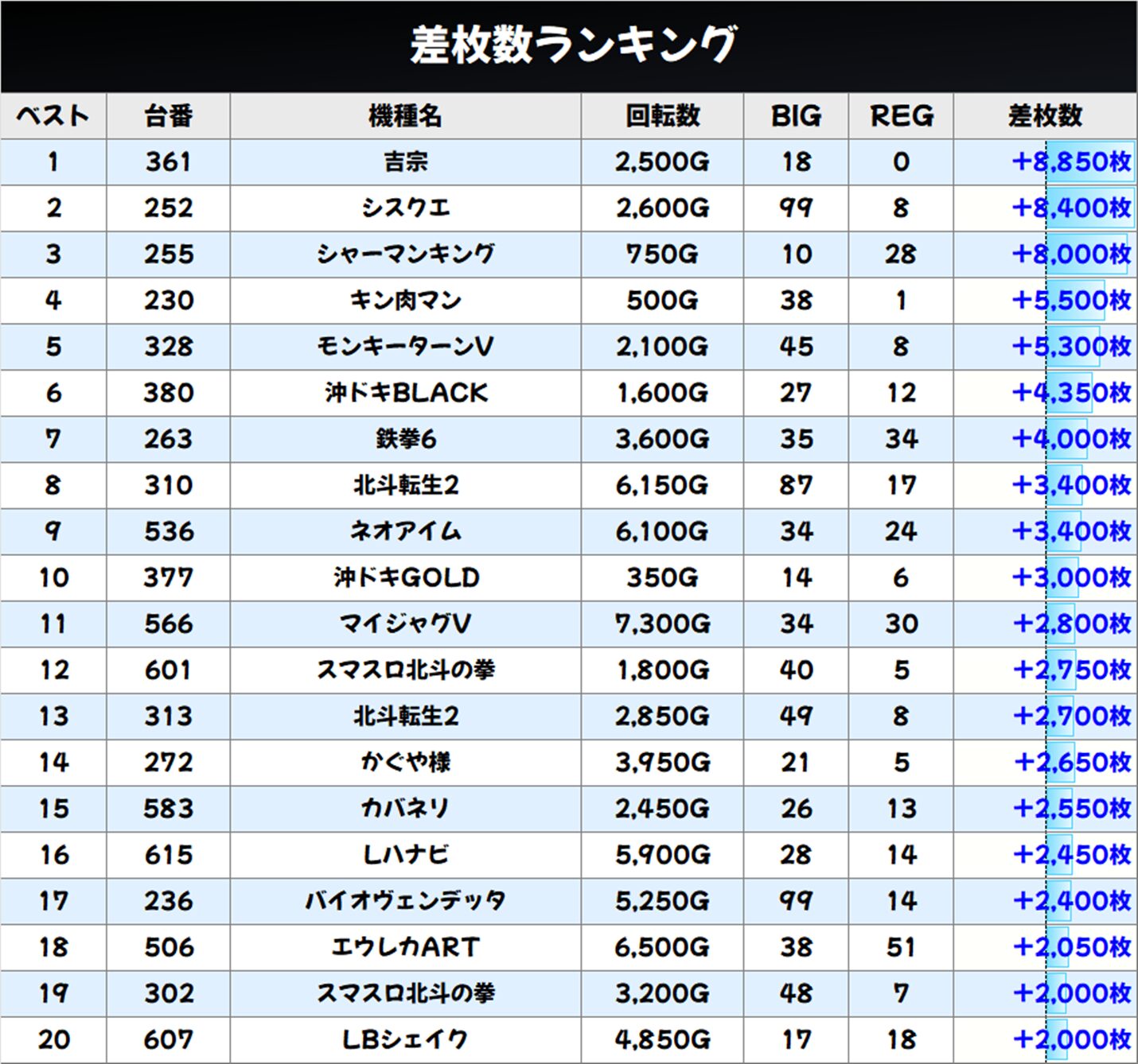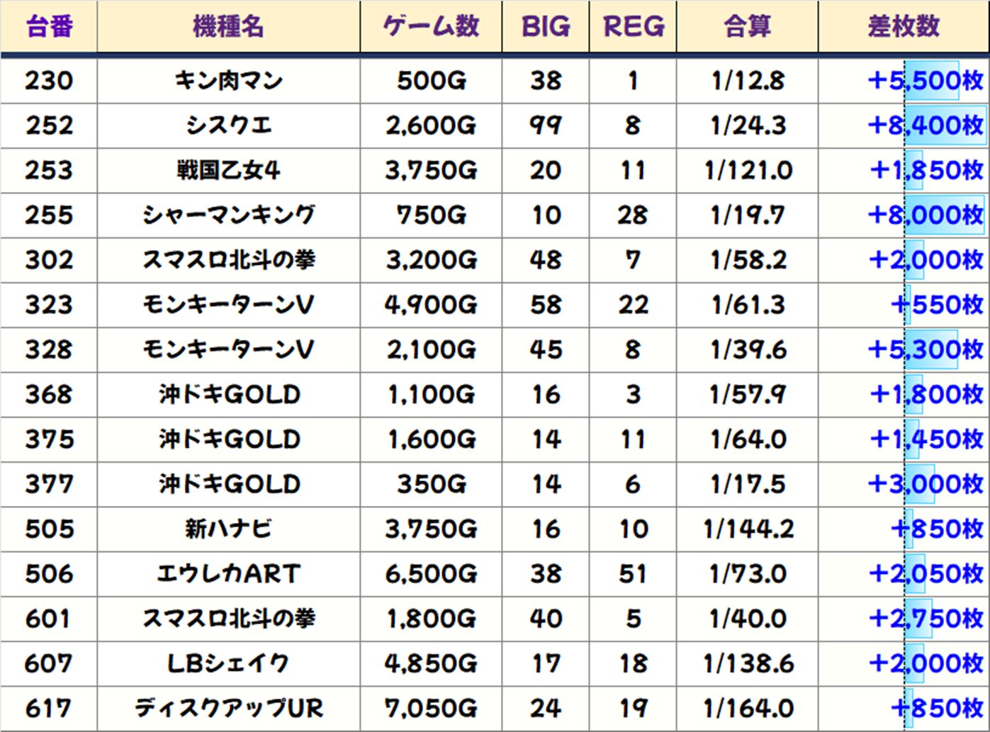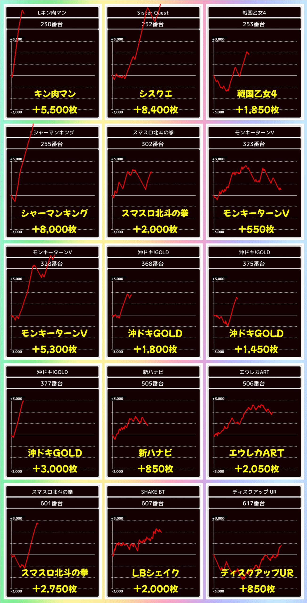 高品質な単品だったので大爆発台も複数出現! 「シスクエ」から+8,400枚、「シャーマンキング」から+8,000枚、「キン肉マン」から+5,500枚、「モンキーターンV」から+5,300枚! ⑥のつく日はやはり大勝ちが狙えるアツい1日ですね。