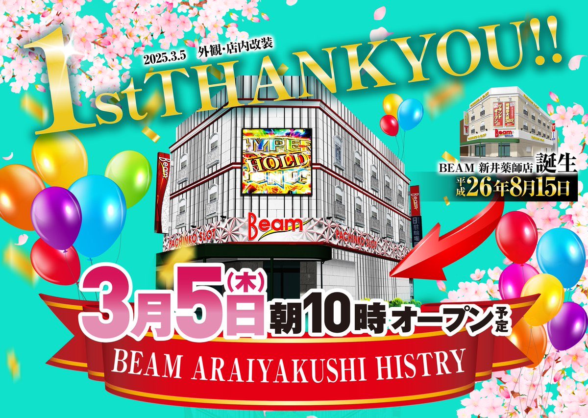 本日3/5は約1か月の店休による大改装を経て新生BEAM新井薬師になって1周年の記念日! 2025年の3/5のリニューアルオープン日は総差枚+9.3万枚、平均差枚+483枚の大盤振る舞いだったので、その再現に期待できそう! リニューアルオープン1周年記念日の本日も至るところから優秀台が出現しそうですね!