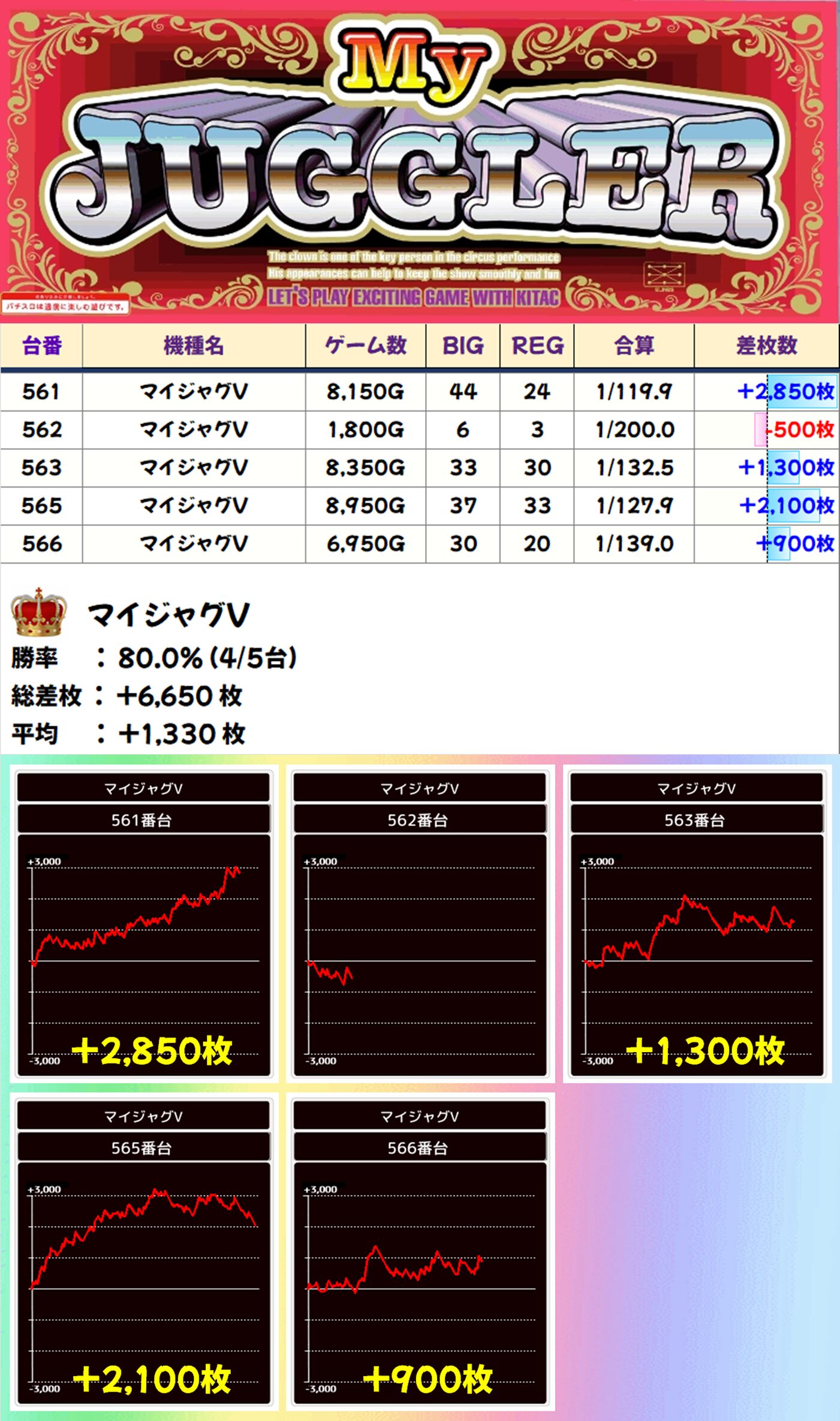 マイジャグV(4/5台):平均+1,330枚