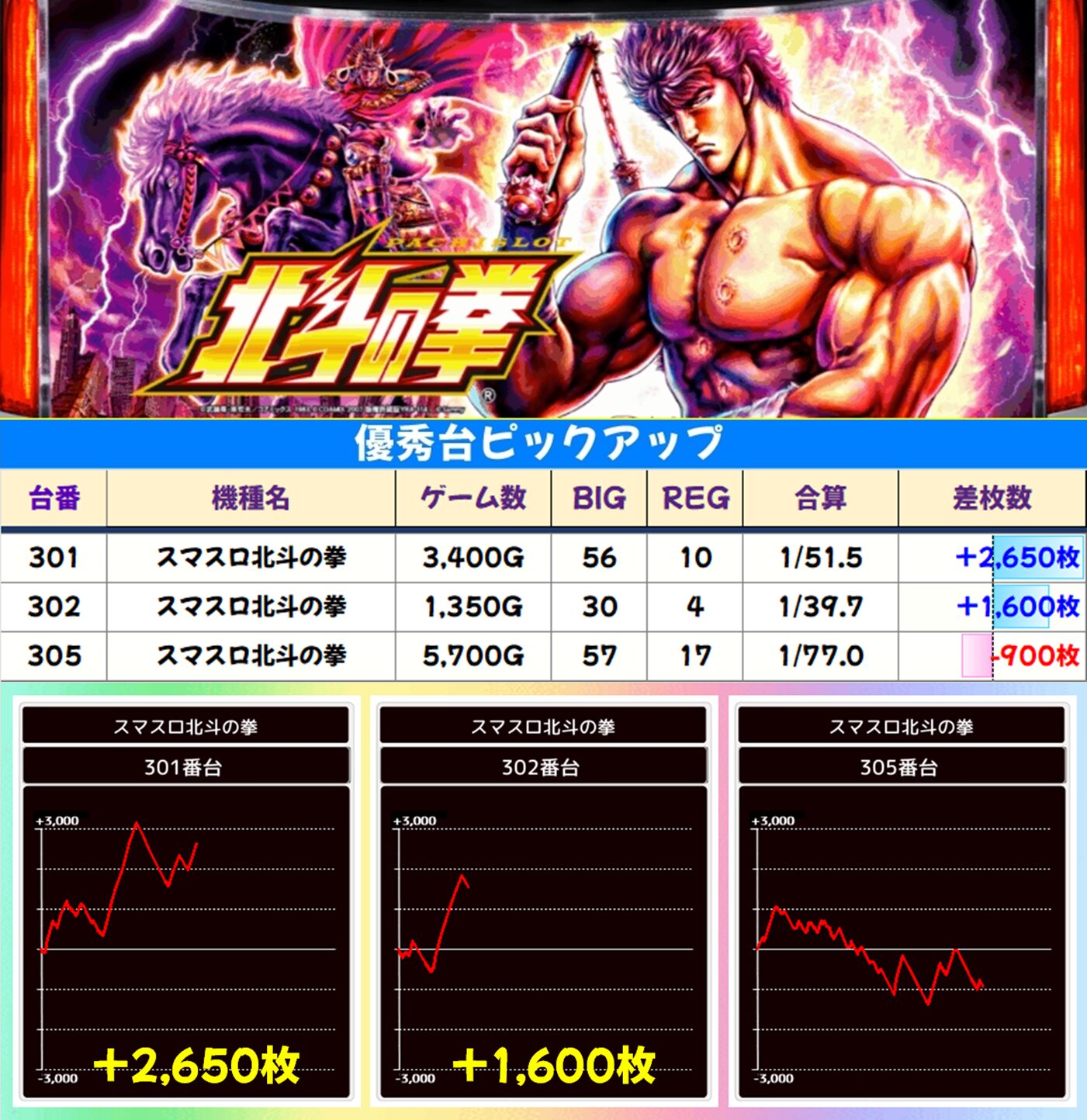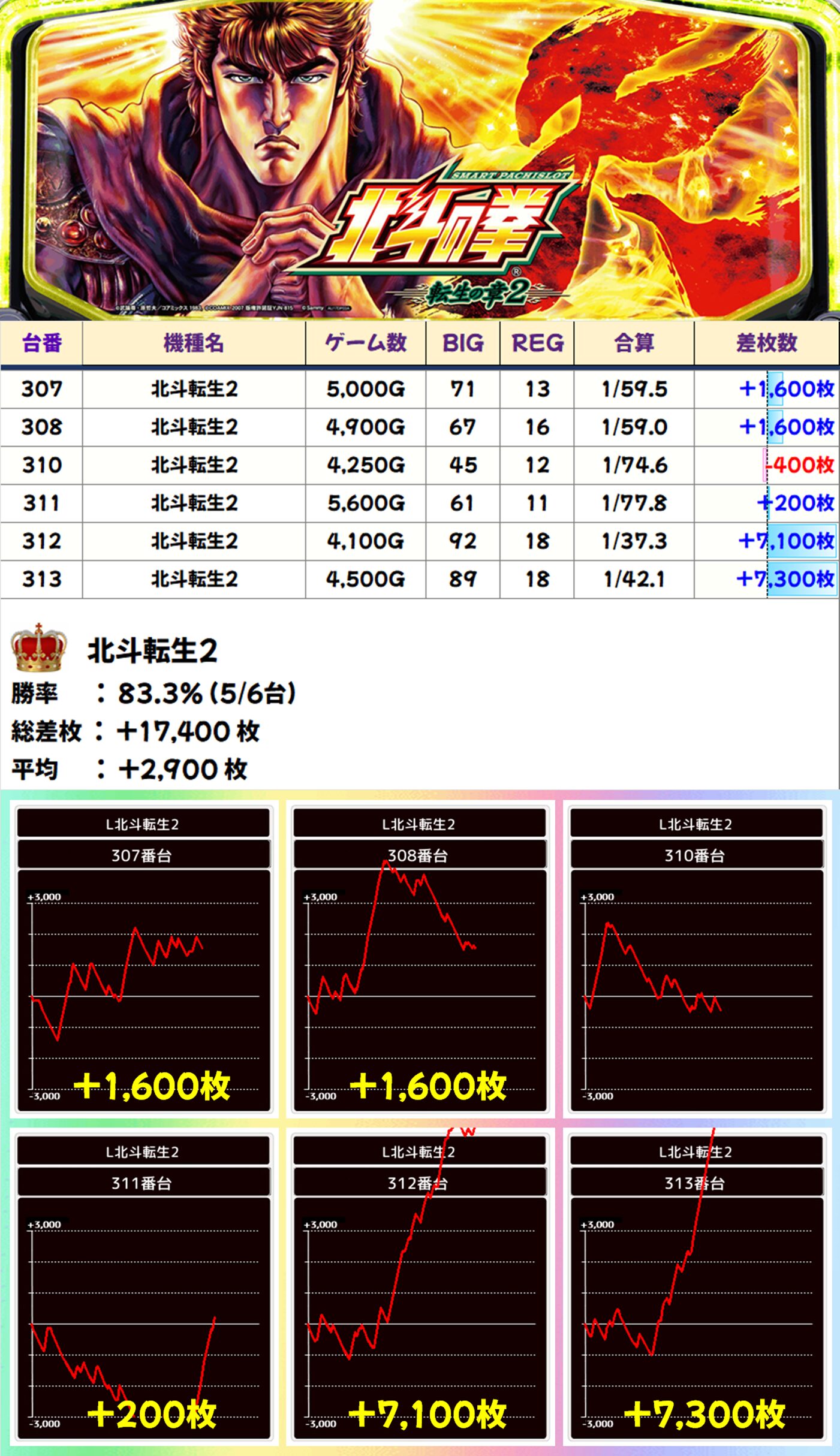 北斗転生2(5/6台):平均+2,900枚