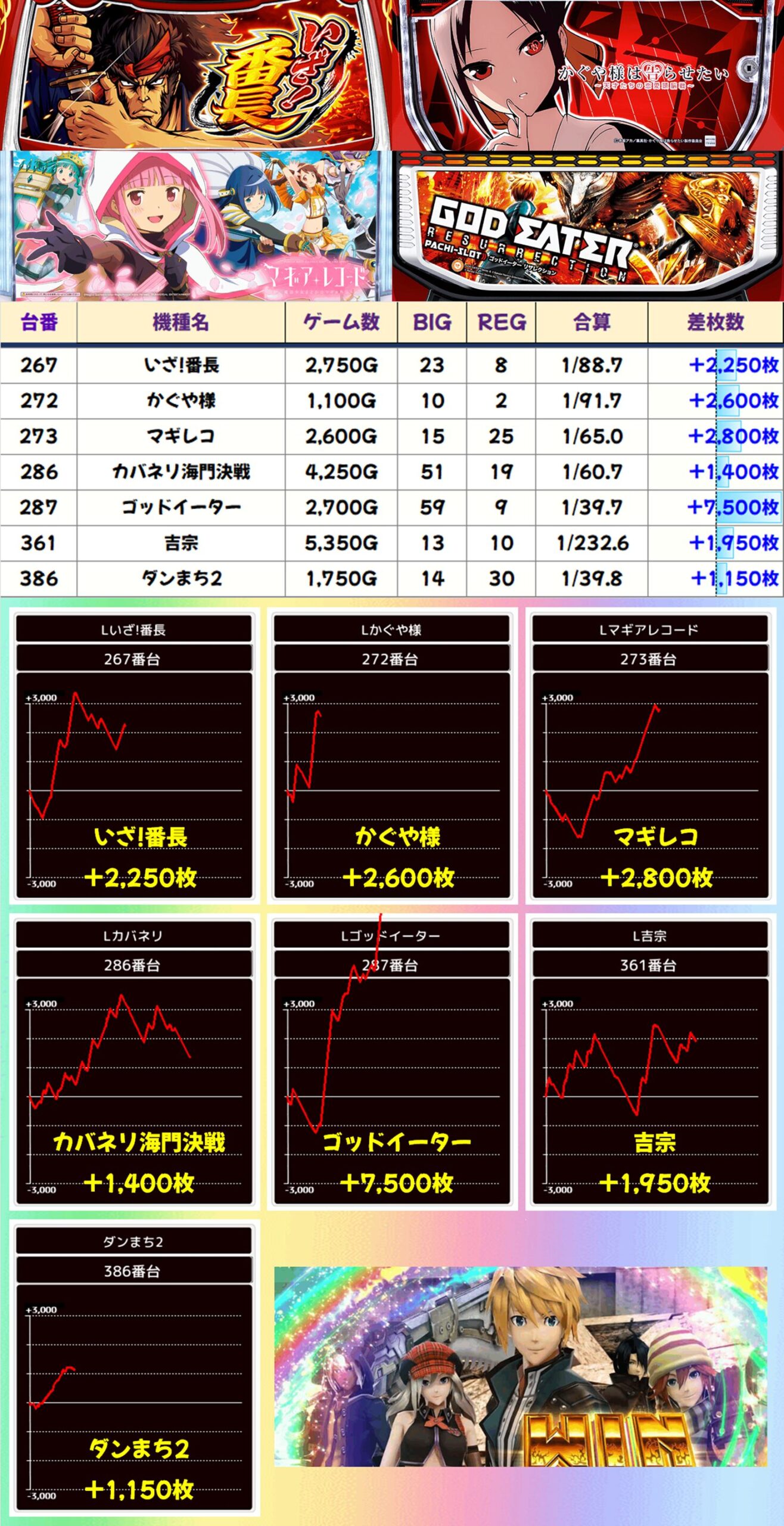 BEAM新井薬師の特定日は2~3台設置の少台数機種が狙い目! 例に漏れず1周年記念日の本日も少台数機種から優秀台が続出! 「ゴッドイーター」の+7,500枚を筆頭に7台が1,000枚以上の出玉を獲得しました。