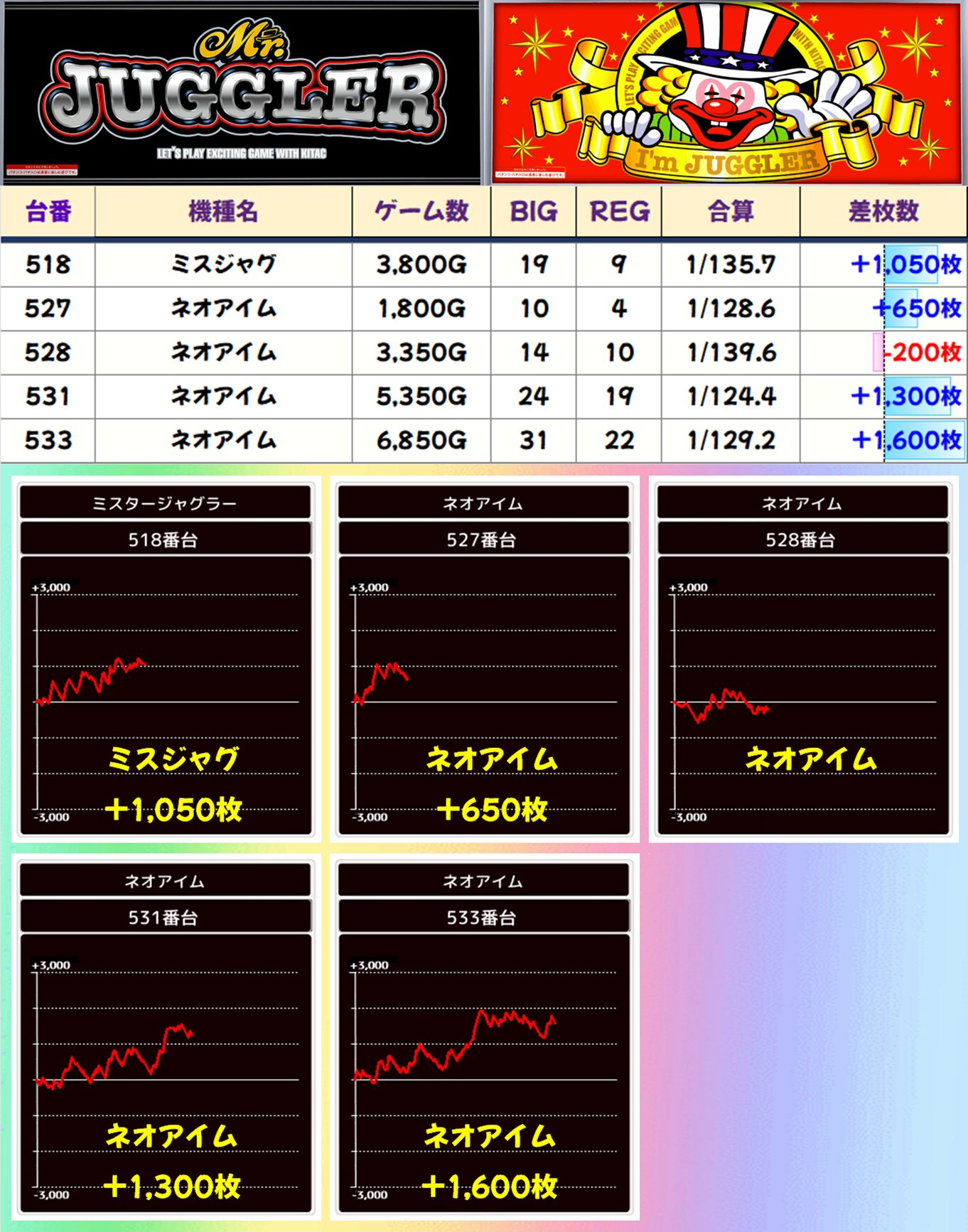 「北斗転生2」は総差枚+17,400枚、平均差枚+2,900枚で6台中5台がプラス差枚。+7,300枚、+7,100枚と大爆発台も複数出現しました。「マイジャグV」は総差枚+6,650枚、平均差枚+1,330枚で5台中4台がプラス。マイナスで終わってしまった1台は打ち込みが足りなかっただけだと思うので、ブン回されていれば全台プラスだったでしょうね。