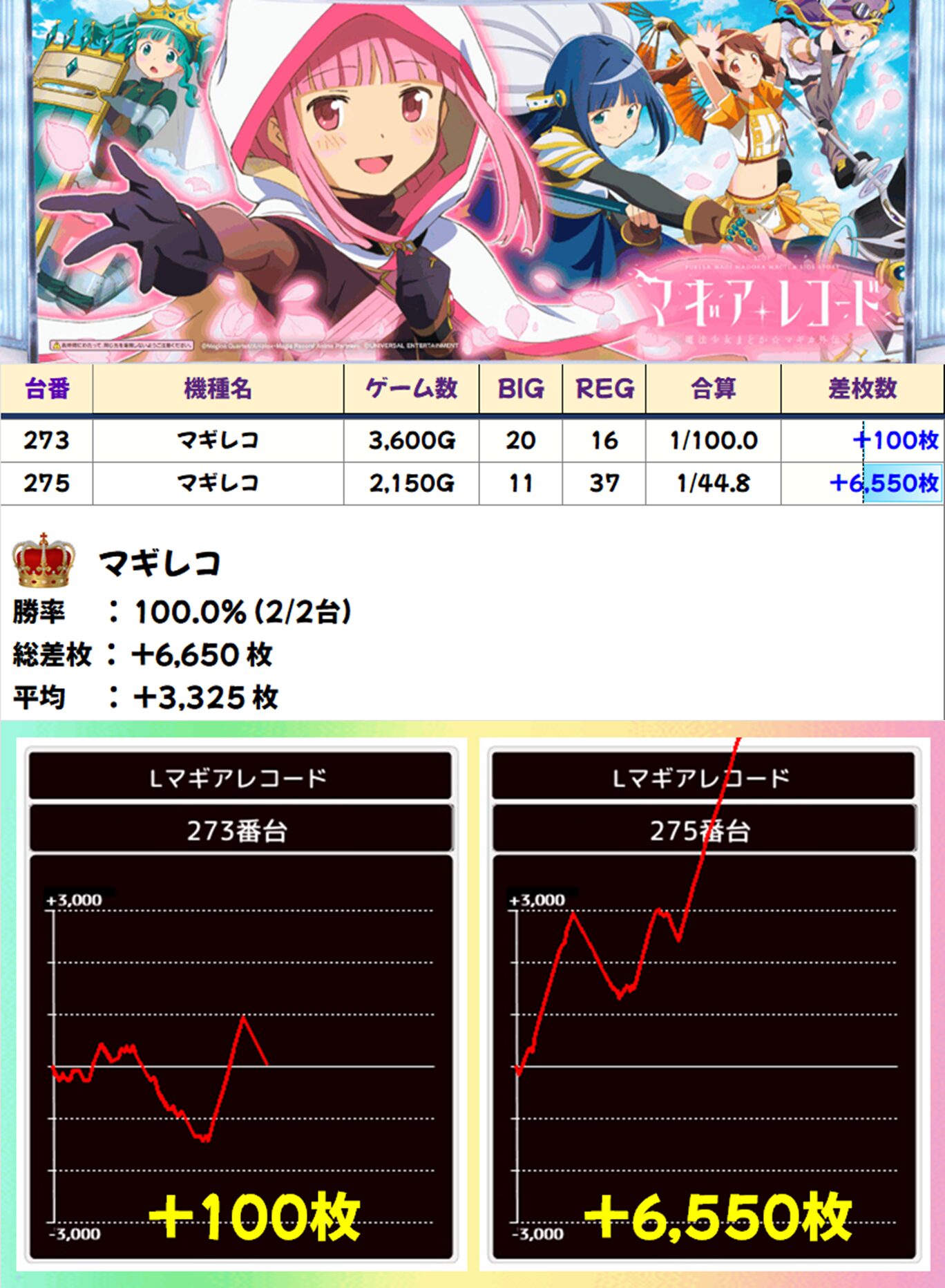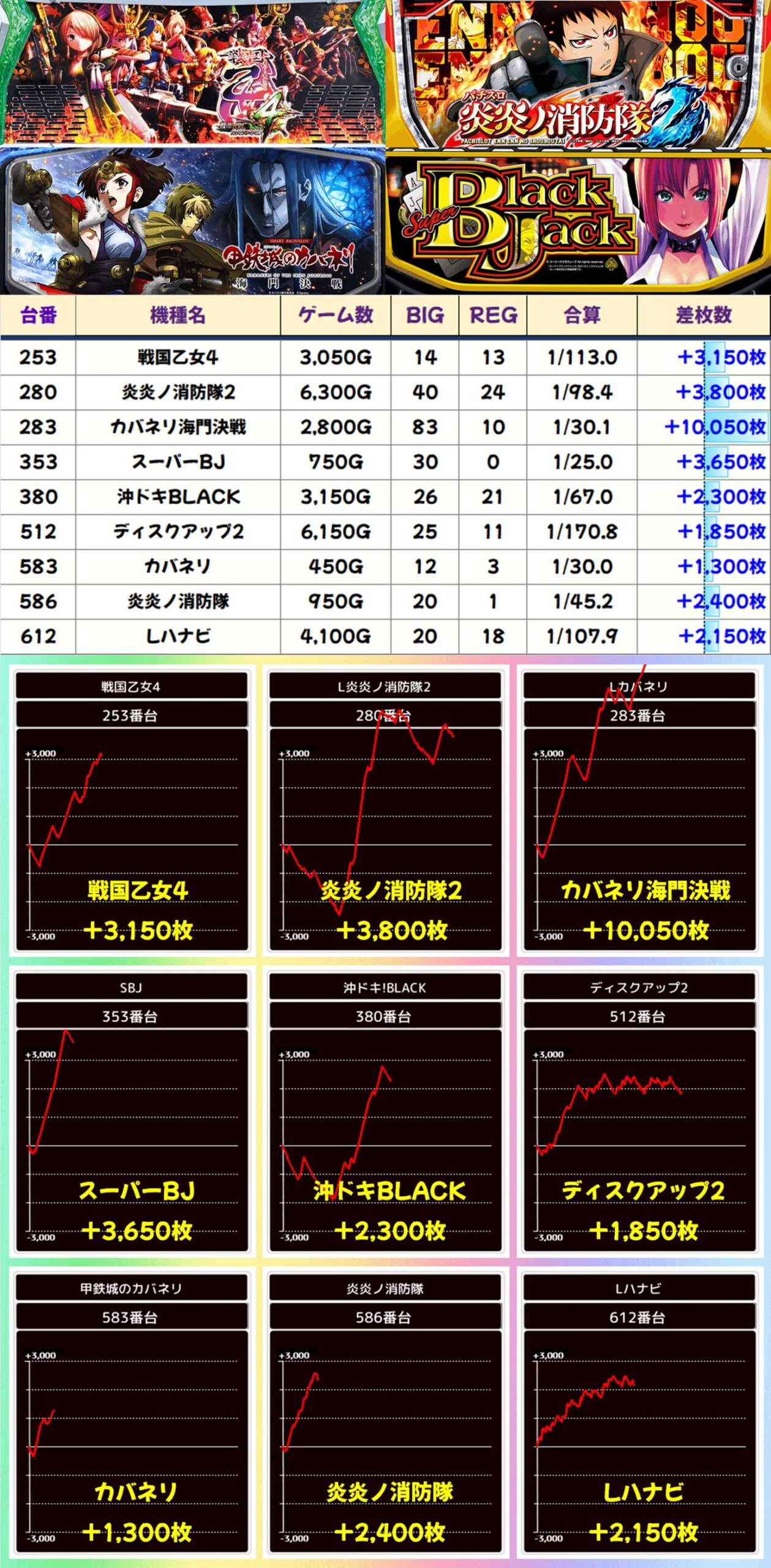 本日も2台設置機種の「マギレコ」と「ヴァルヴレイヴ」がお宝機種に! 結果は「マギレコ」が平均差枚+3,325枚、「ヴァルヴレイヴ」が平均差枚+2,975枚だったので、どちらも全台系だったのかも? 「カバネリ海門決戦」から+10,050枚、「炎炎ノ消防隊2」から+3,800枚、「スーパーBJ」から+3,650枚、「戦国乙女4」から+3,150枚と、その他の2~3台設置機種からも大量出玉が炸裂したので、⑥のつく日は相変わらず少台数設置機種がアツいですね!