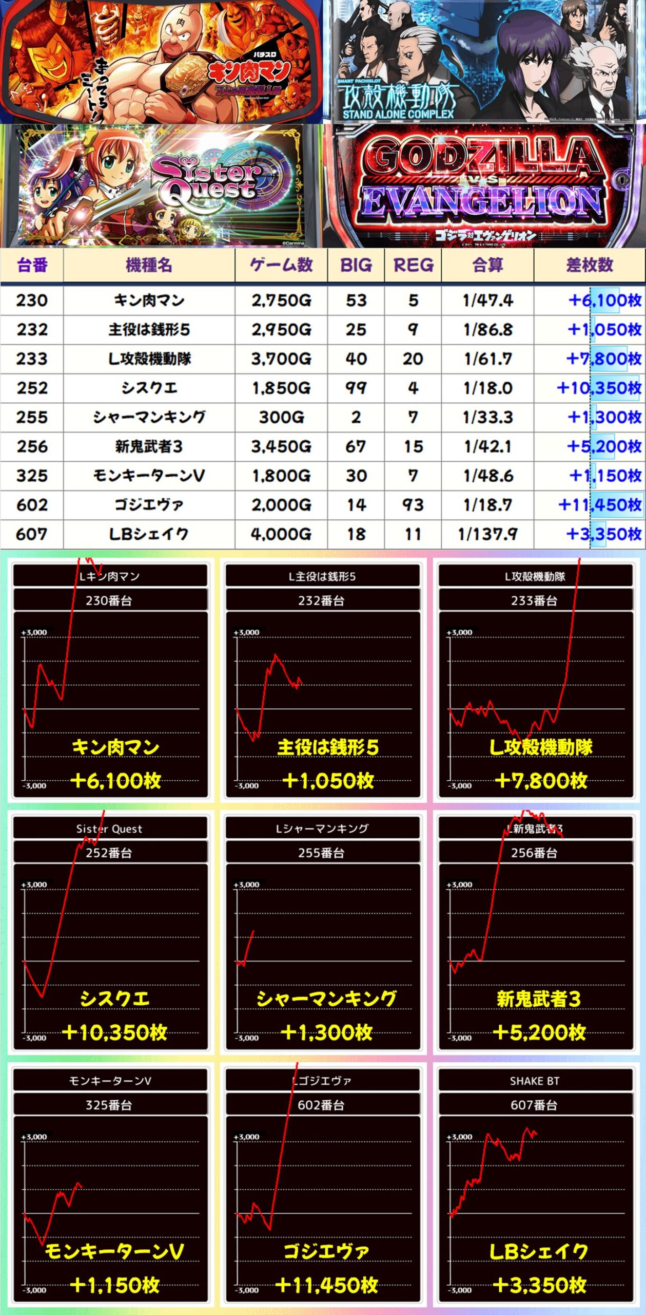 ⑥のつく日は単品も盛りだくさん。本日は「ゴジエヴァ」から+11,450枚、「シスクエ」から+10,350枚、「L攻殻機動隊」から+7,800枚、「キン肉マン」から+6,100枚、「新鬼武者3」から+5,200枚と1台設置機種から大爆発台が複数出現! ⑥のつく日はお宝台が散りばめられているので、メイン機種から1台設置機種までどこを攻めてもチャンスがありますよ。