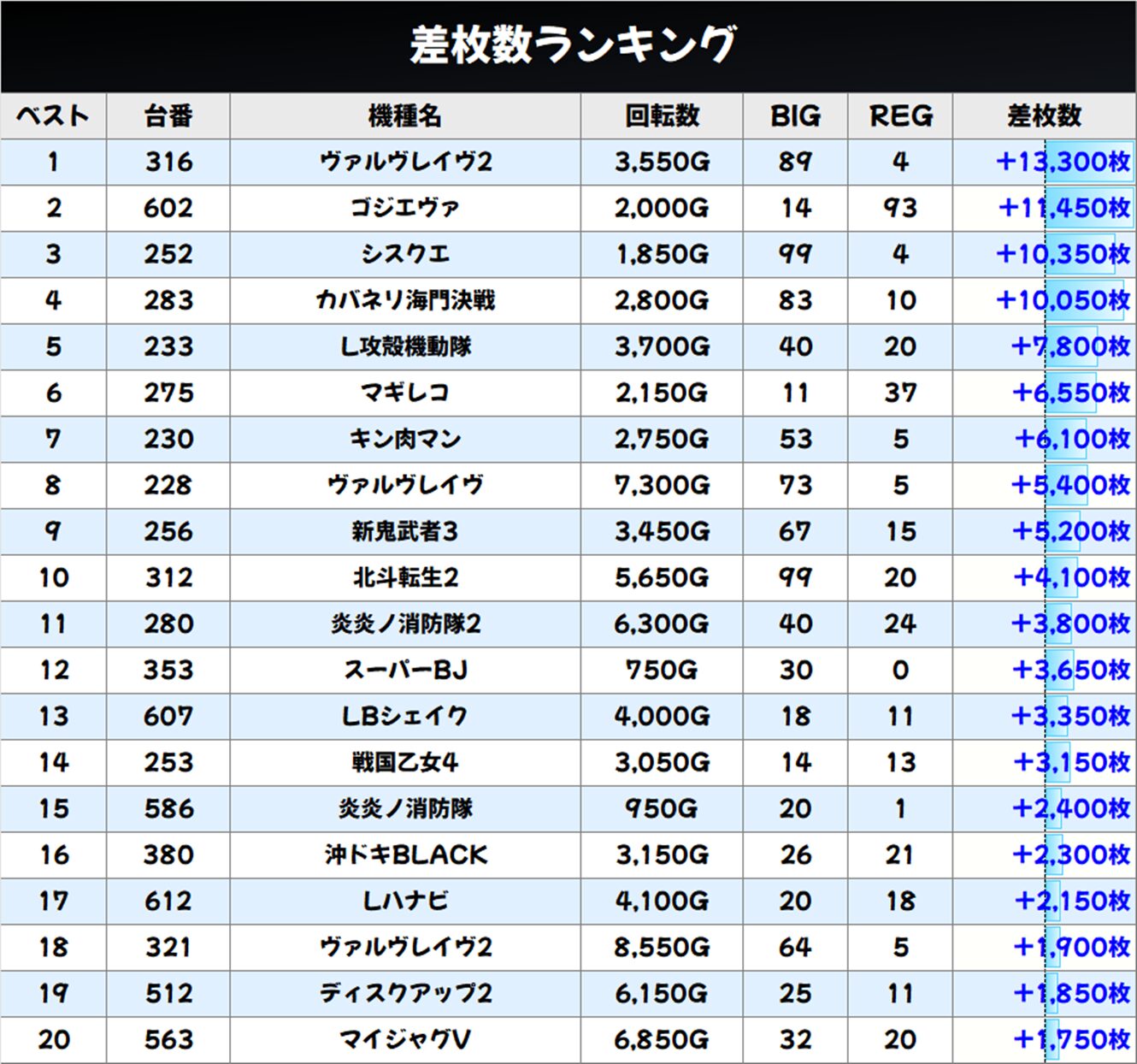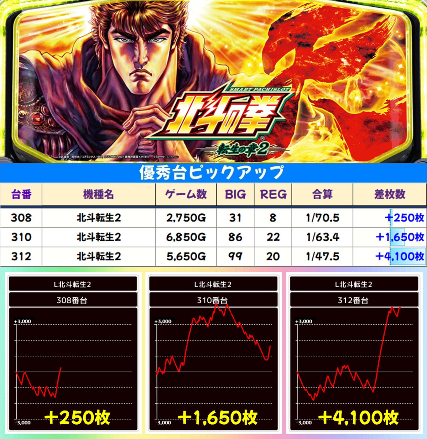 「ヴァルヴレイヴ2」は平均差枚+1,579枚で7台中4台がプラス差枚。316番台から万枚オーバーの出玉も炸裂しました。「北斗転生2」は3台がプラス。こちらからも+4,100枚の爆発台が出現!