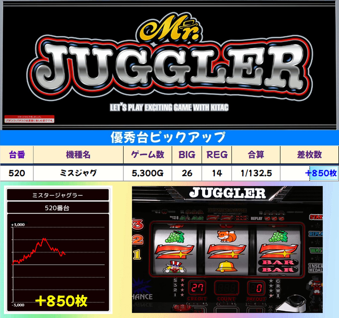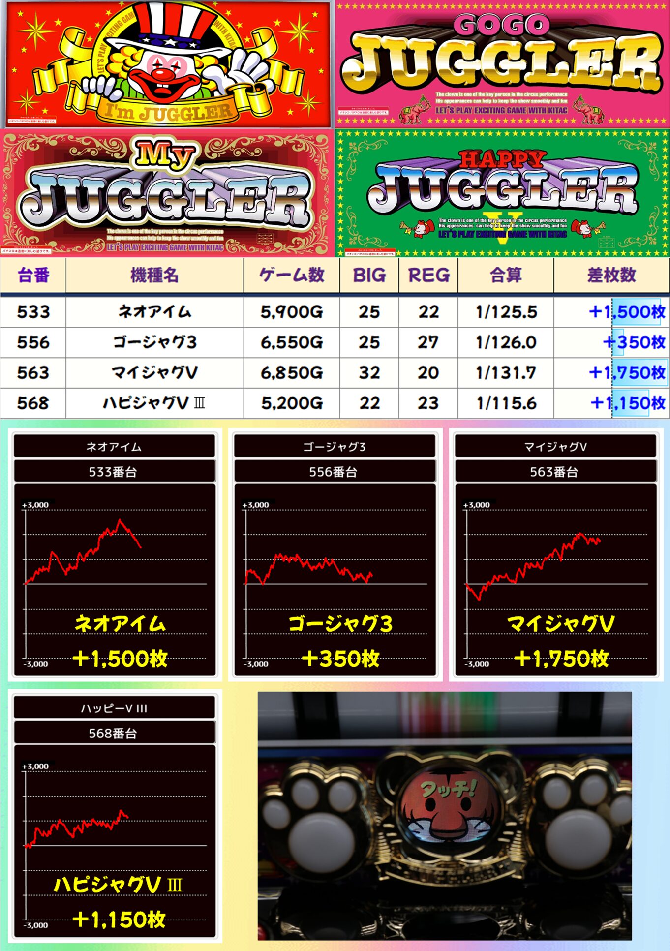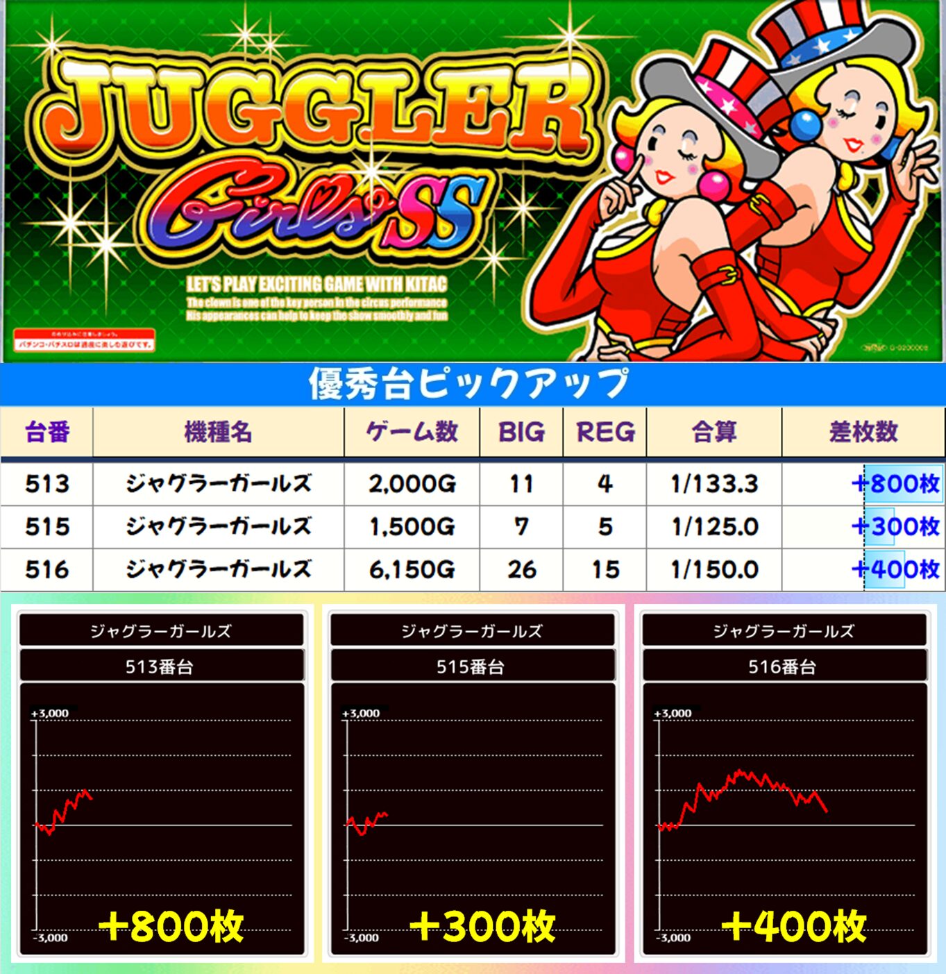 ⑥のつく日はジャグラーの扱いも◎! 本日は「ジャグラーガールズ」と「ミスタージャグラー」の2機種が高配分。もちろん、その他のジャグラーにもお宝台が多数ありました。
