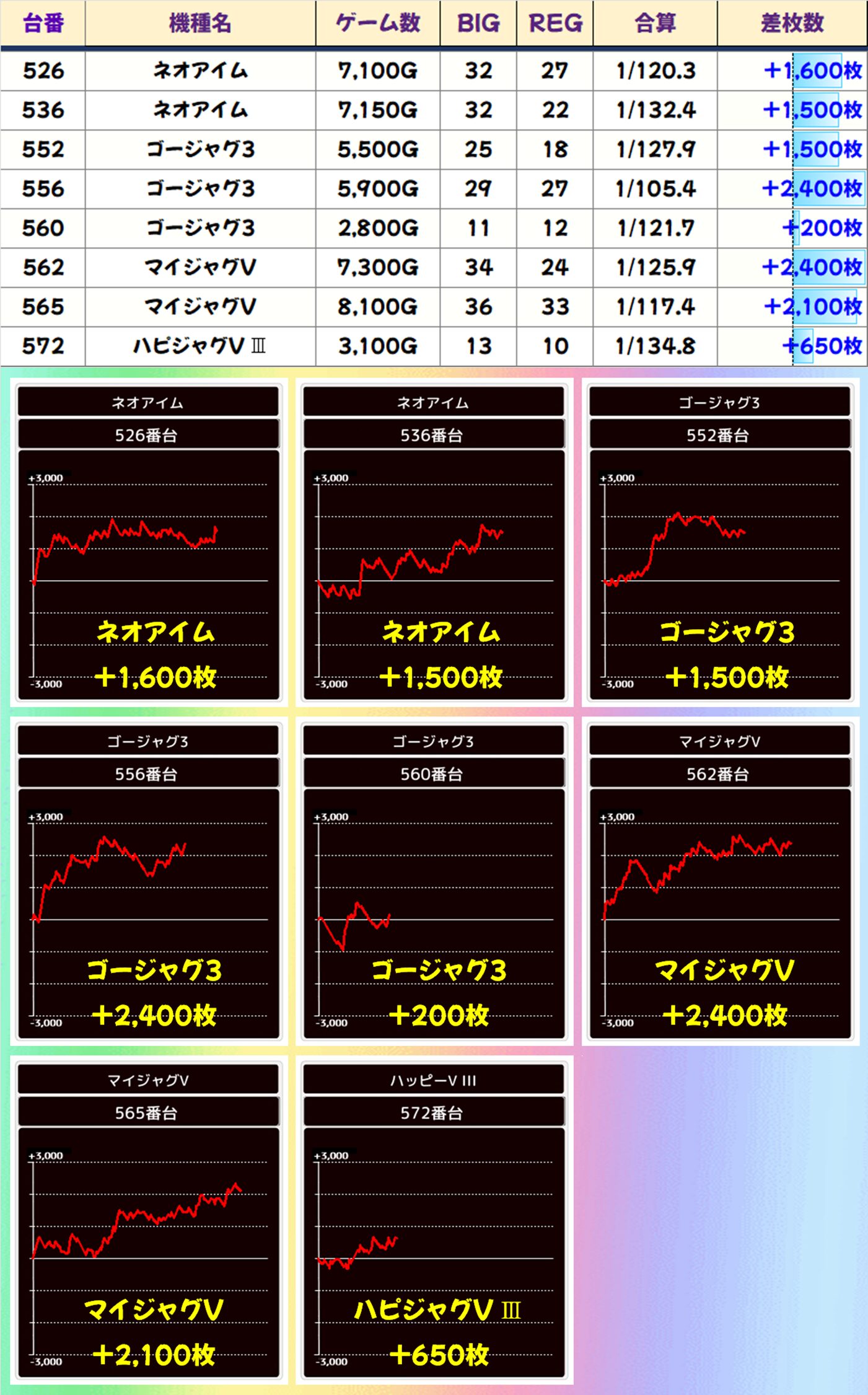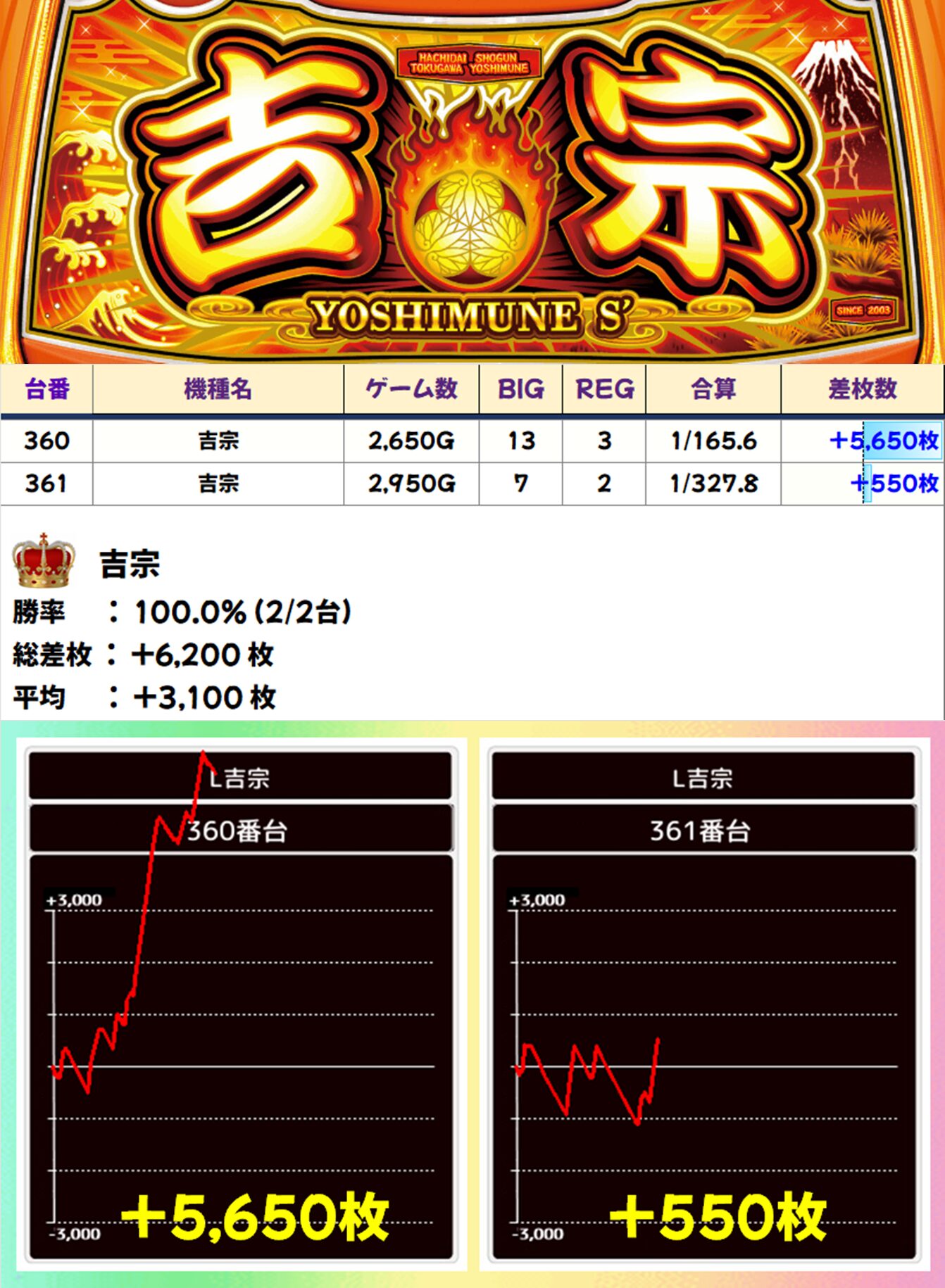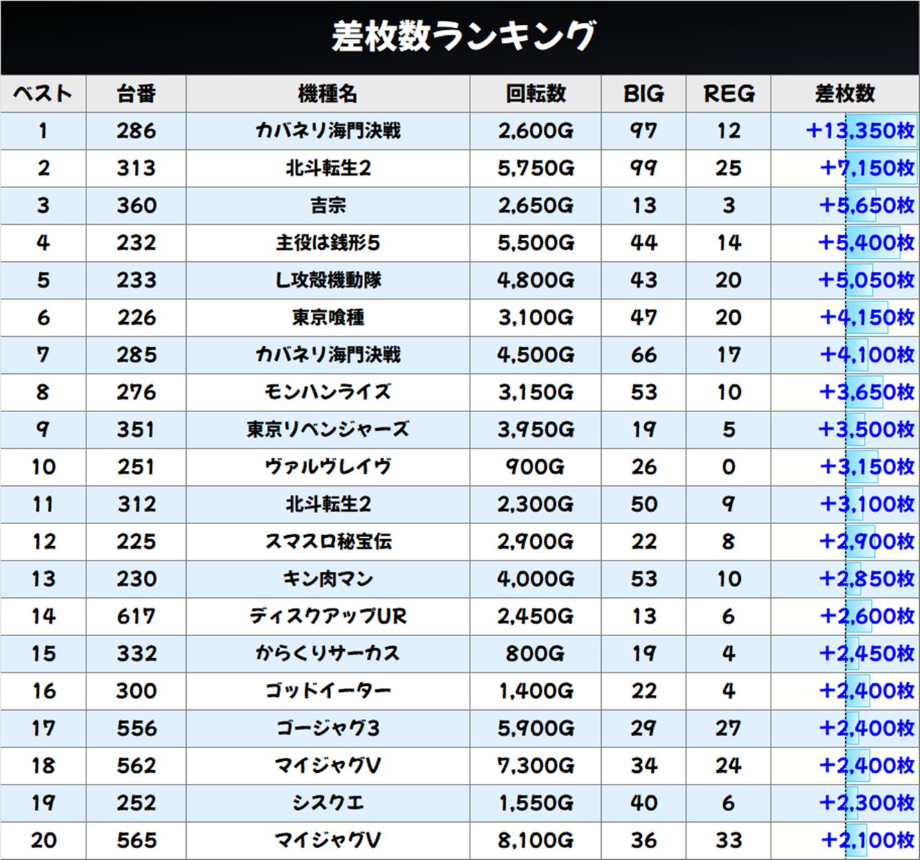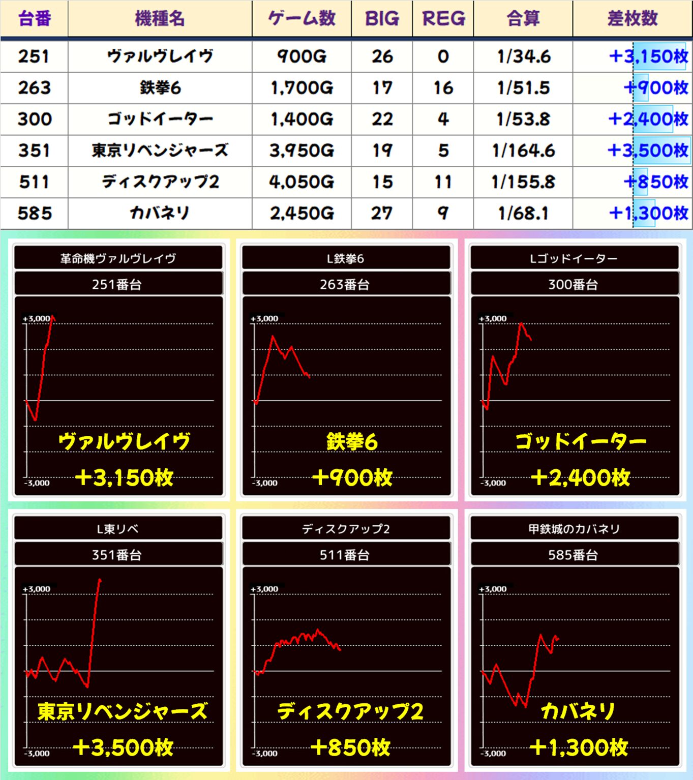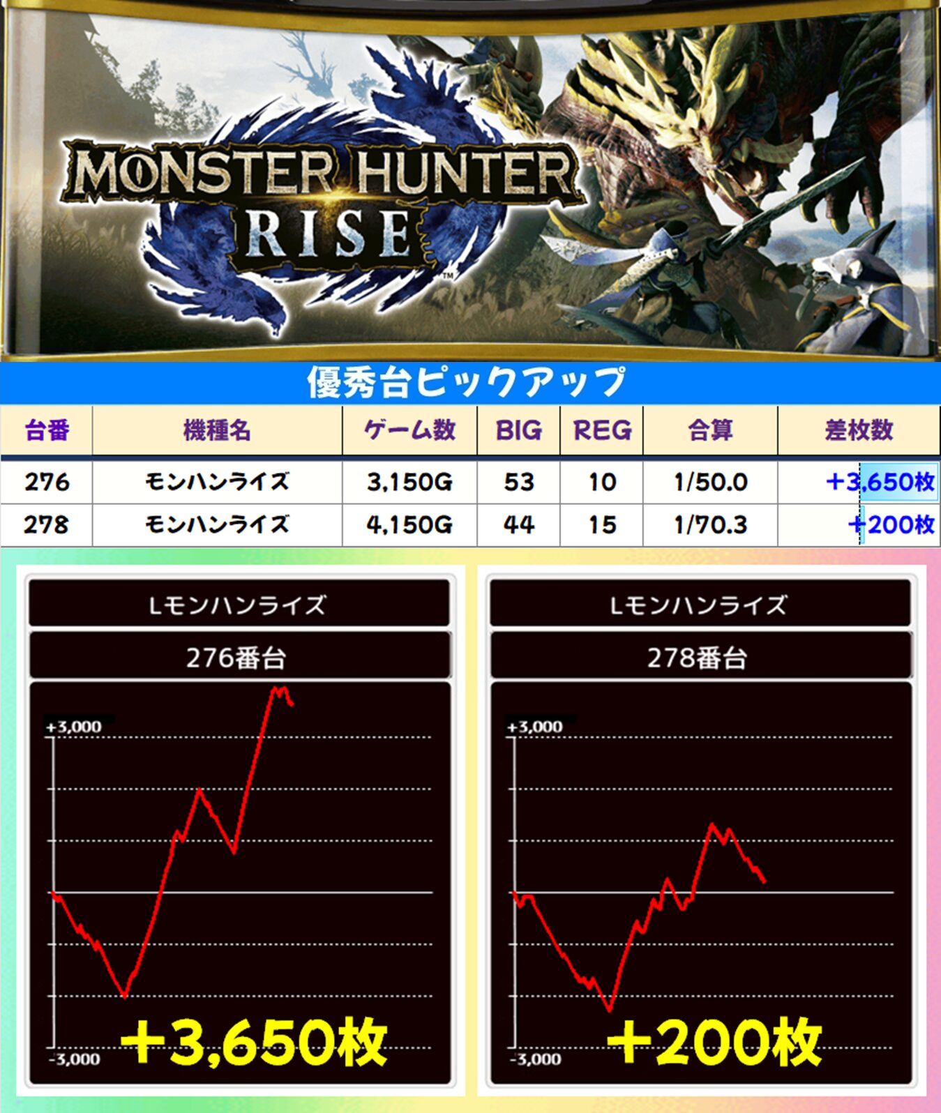 本日は「吉宗」「モンハンライズ」「Lハナビ」の3機種がお宝機種に! 「東京リベンジャーズ」から+3,500枚、「ヴァルヴレイヴ」から+3,150枚など機種イチの仕掛けからも優秀台が出現しました。